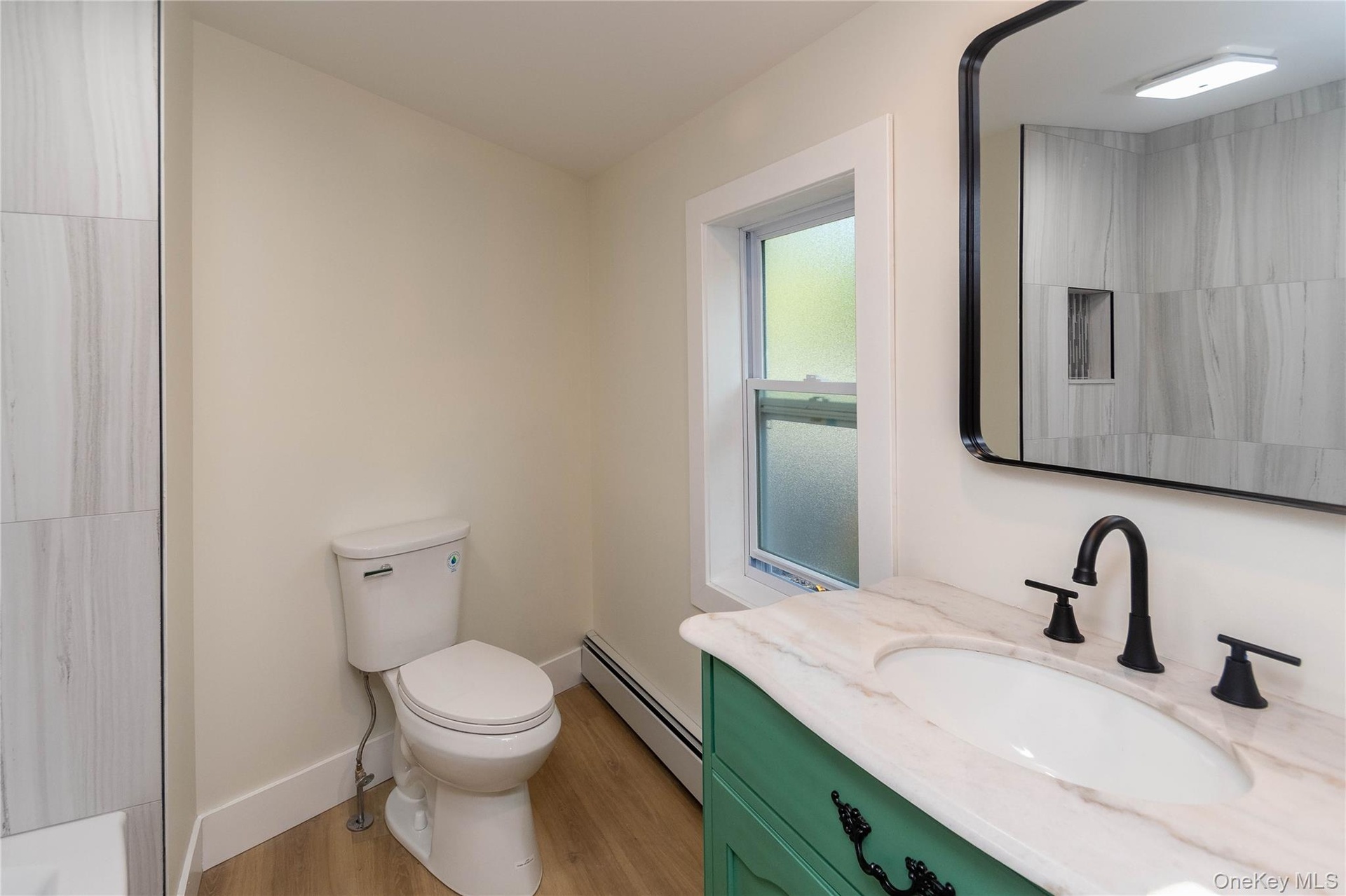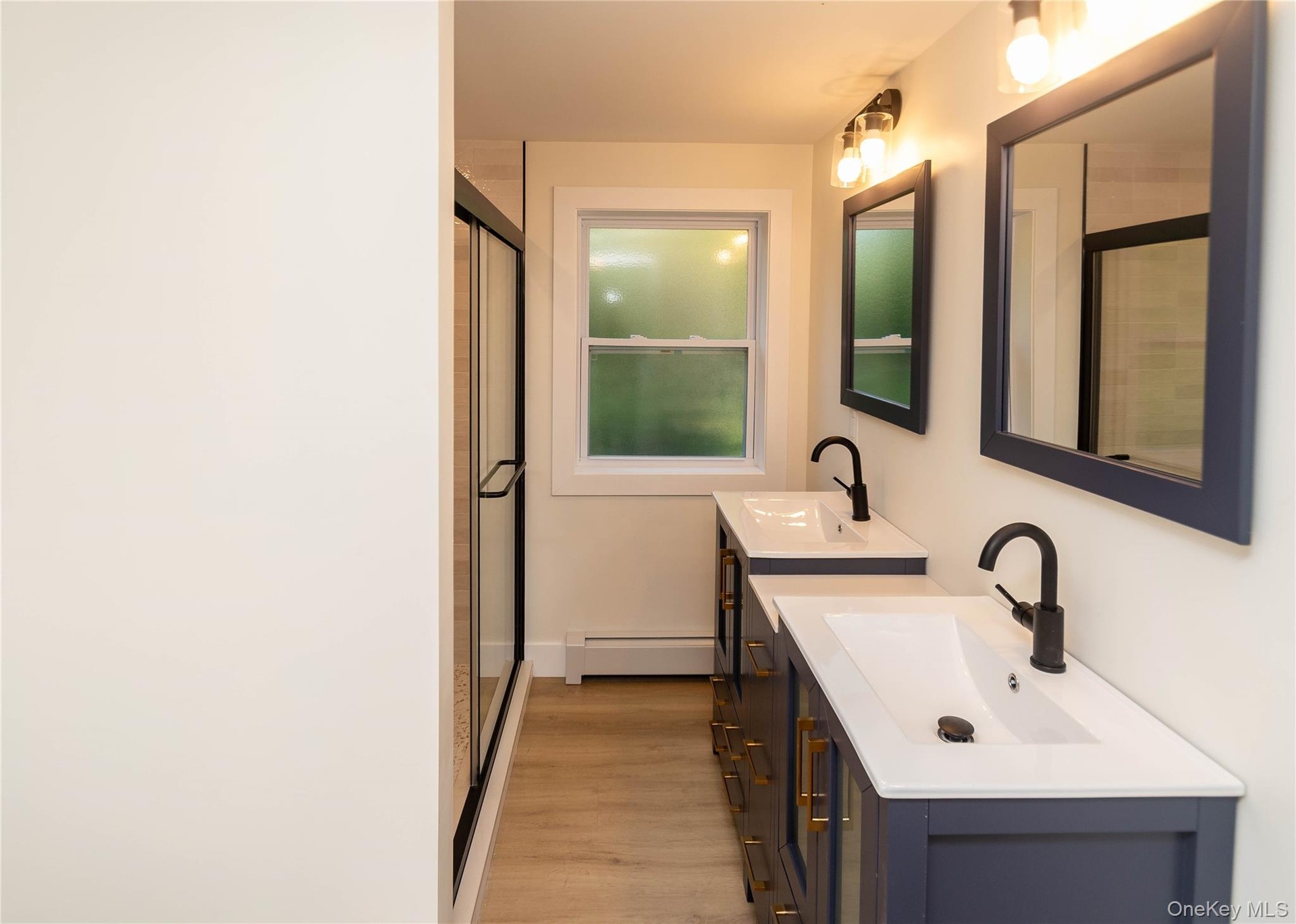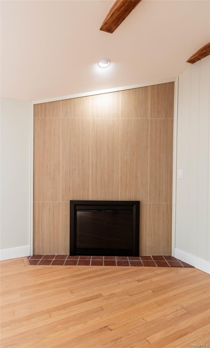 - Living room featuring hardwood floors, skylights, exposed beams and modern fireplace.