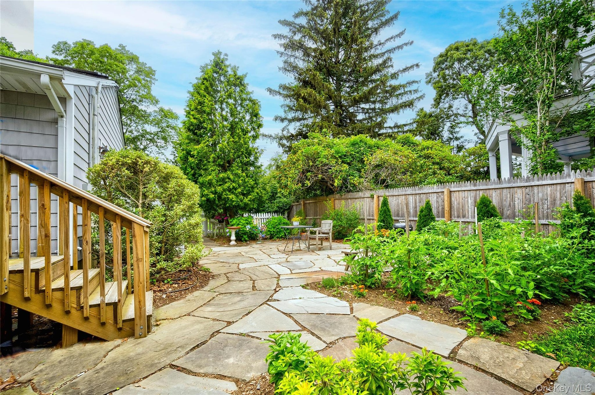 - Fenced backyard with a patio and stairway