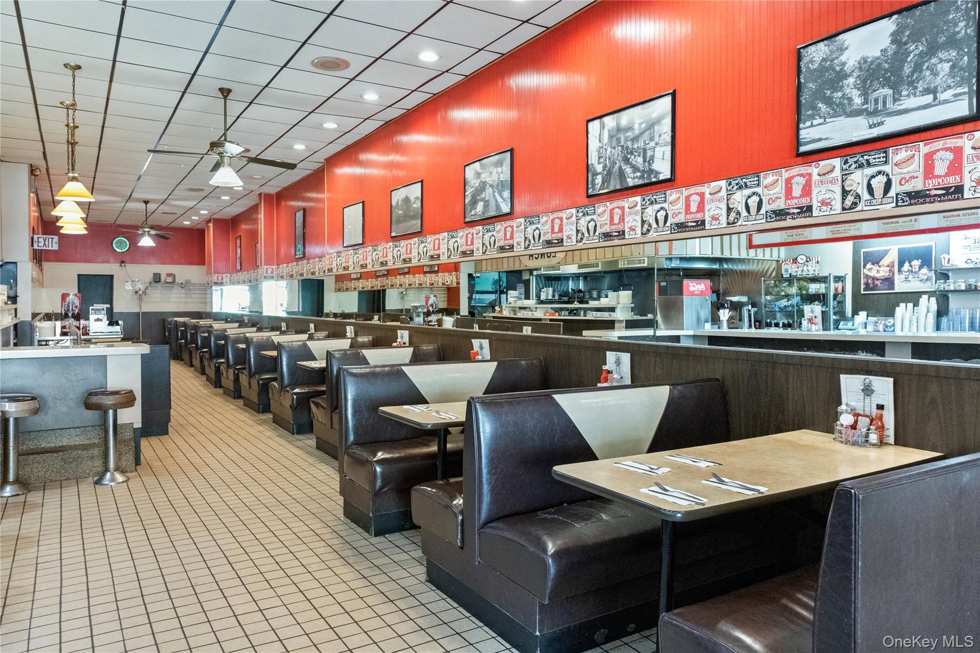 This iconic space offers multiple income streams: walk-in candy and chocolate bar sales, a robust ice cream and shake counter, food delivery via UberEats/DoorDash, and continued location rental for media use. The interior captures classic diner charm with a 25-foot bar top lined with barstools, several booths seating 4-6 people, and fixtures that evoke an authentic mid-20th-century feel.