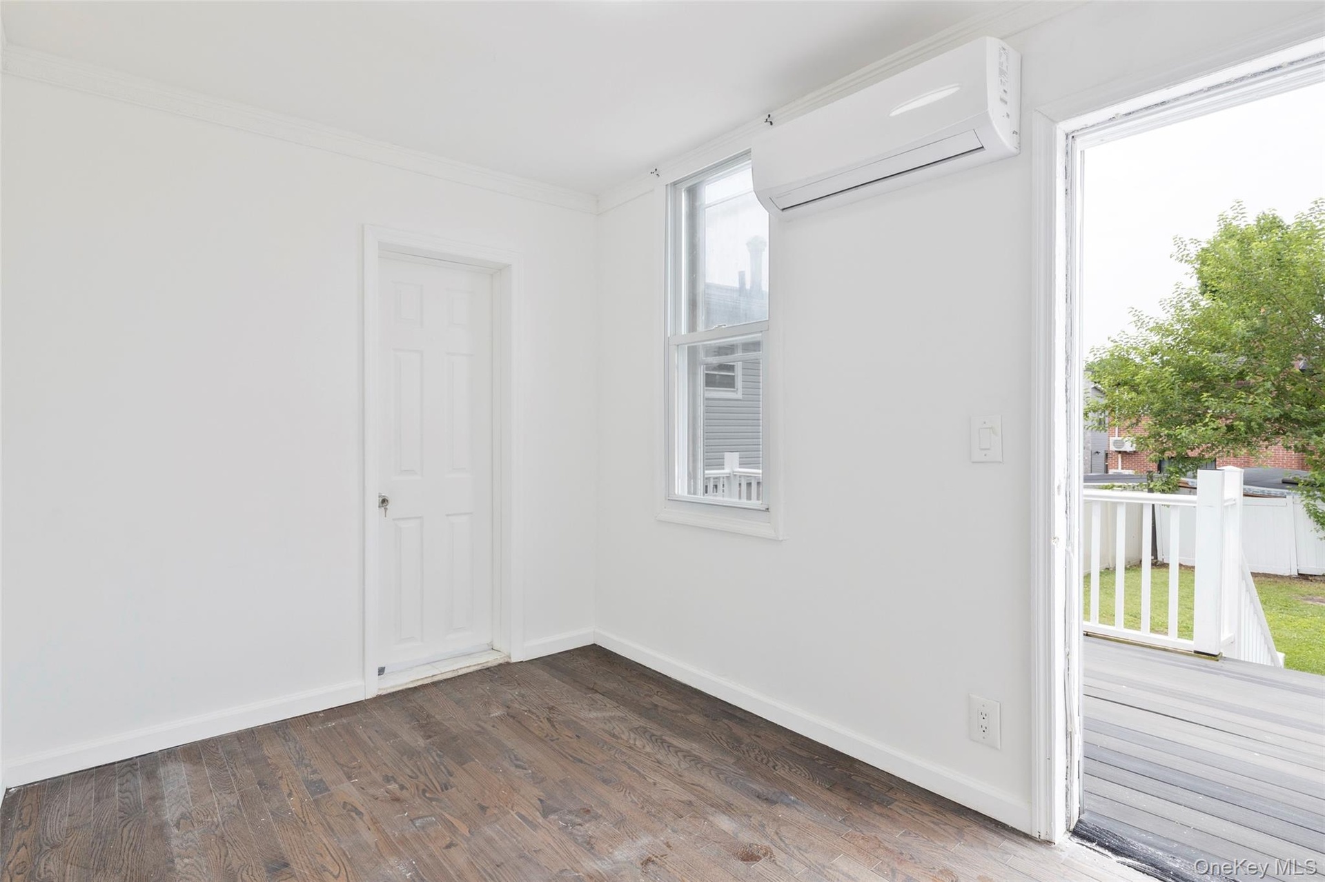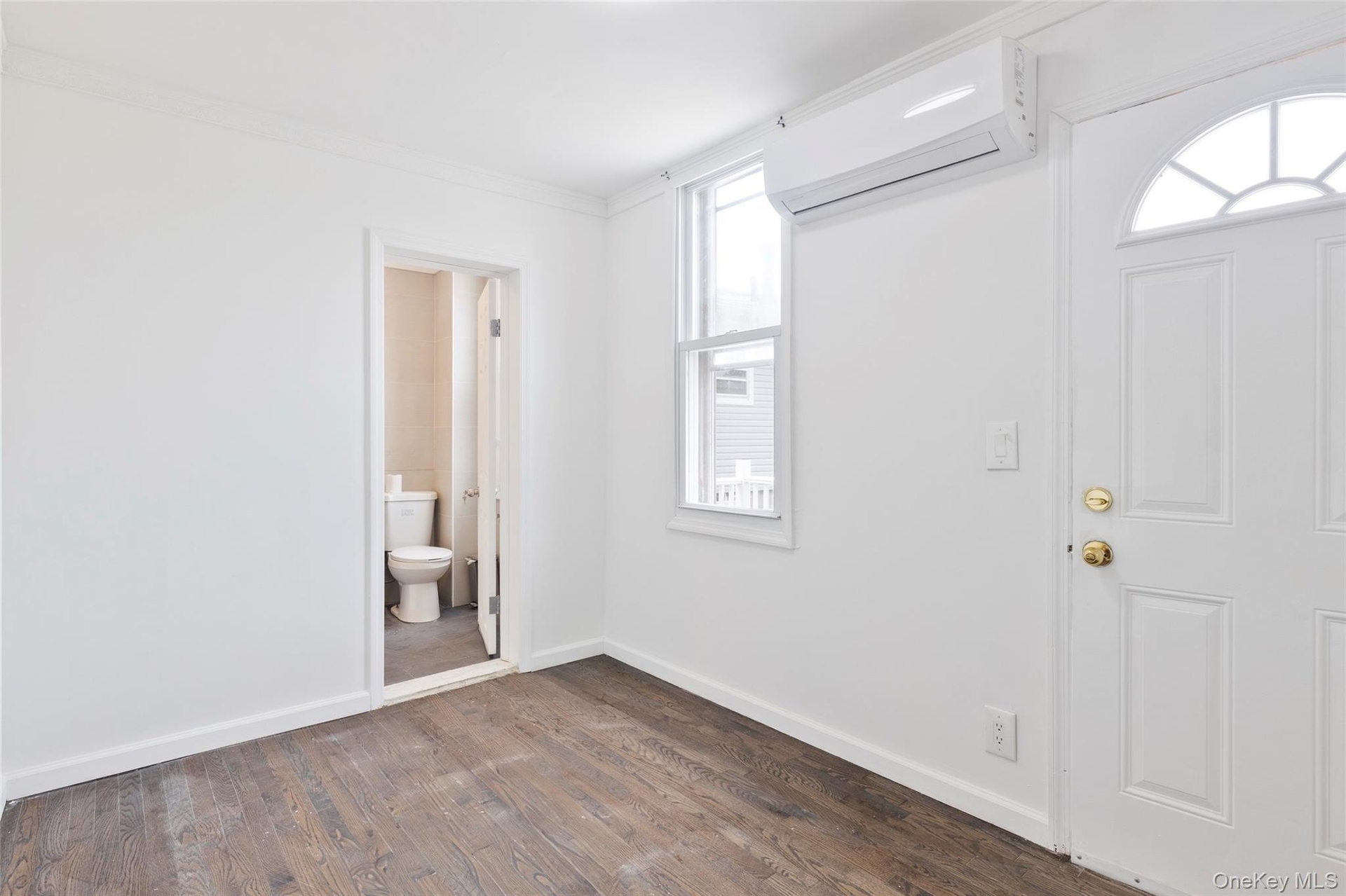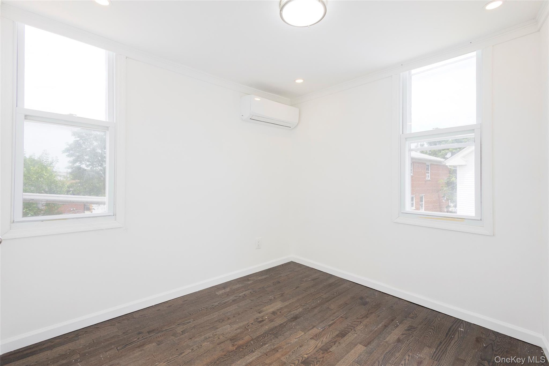 - Empty room featuring a wall mounted air conditioner, dark wood-style floors, and ornamental molding