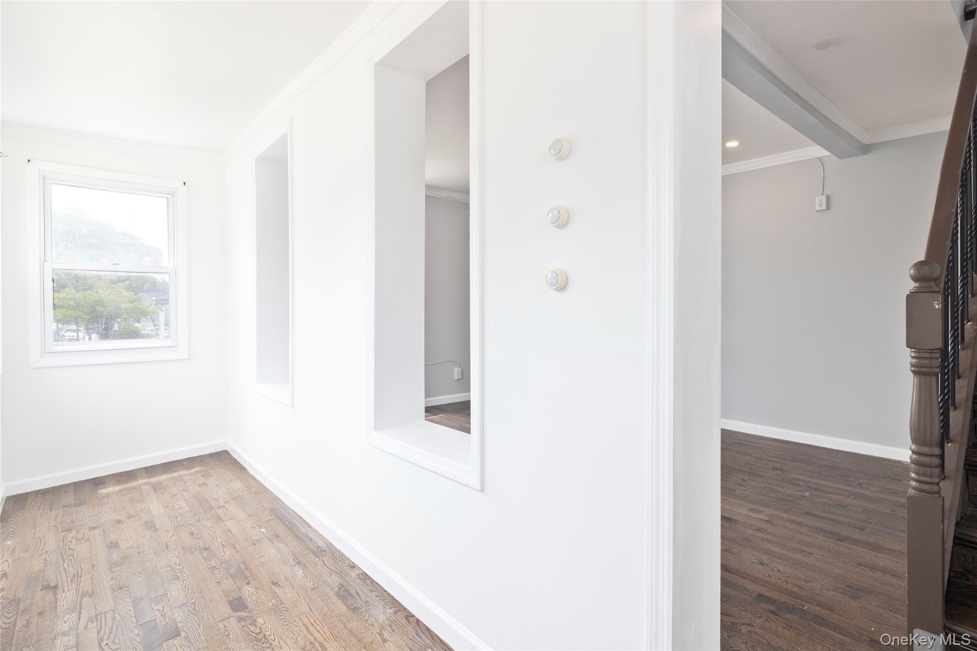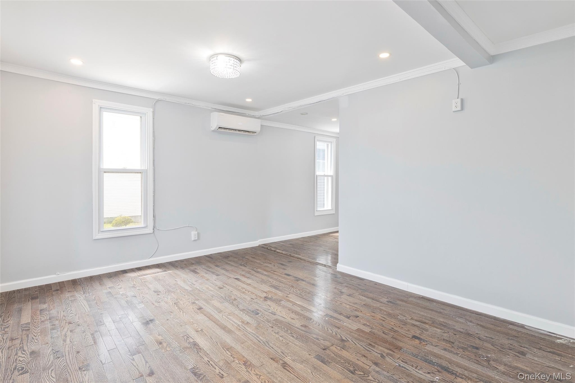 - Empty room with a wall unit AC, ornamental molding, wood finished floors, and recessed lighting