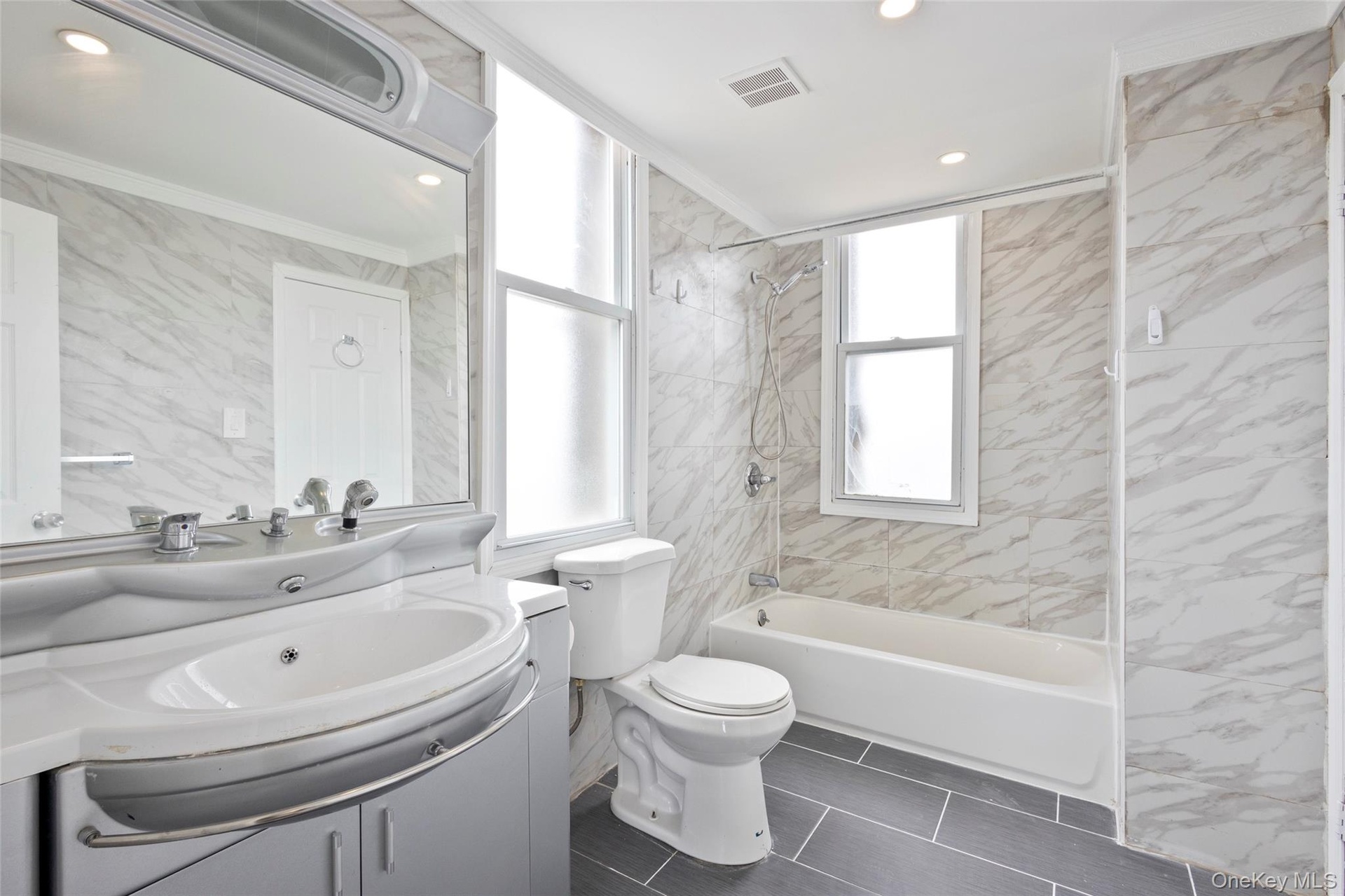 - Bathroom with washtub / shower combination, vanity, crown molding, tile walls, and recessed lighting