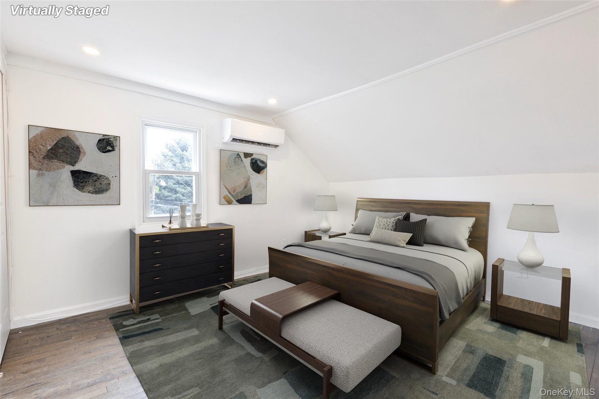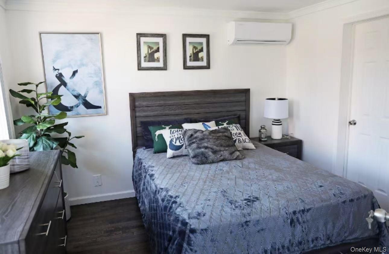 - Bedroom with an AC wall unit, dark wood-style flooring, and ornamental molding
