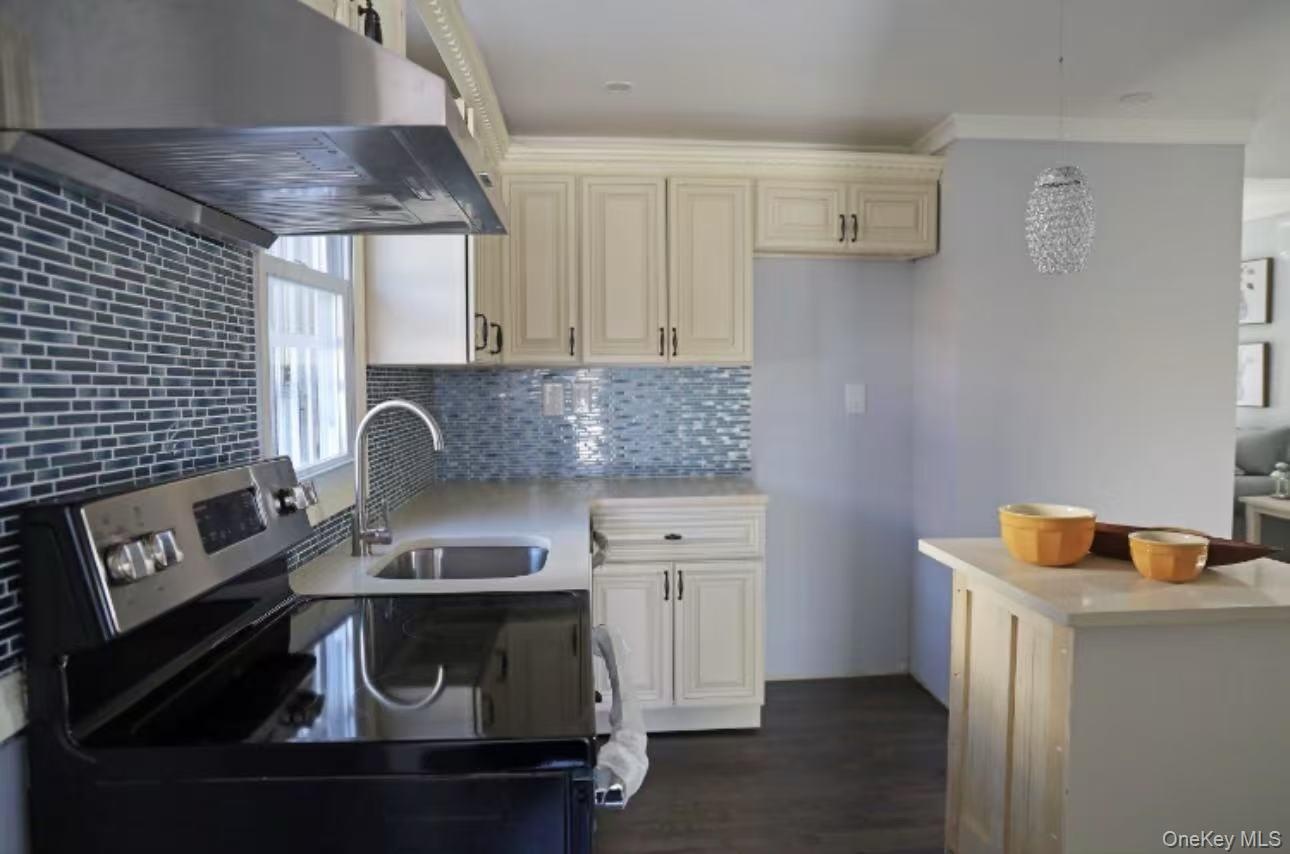 - Kitchen with stainless steel range with electric stovetop, ventilation hood, light countertops, backsplash, and crown molding