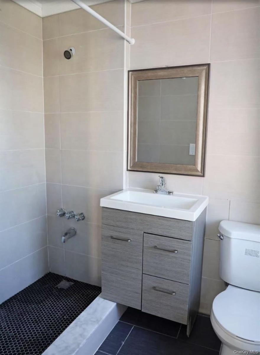 - Bathroom featuring tiled shower, vanity, tile patterned floors, and tile walls