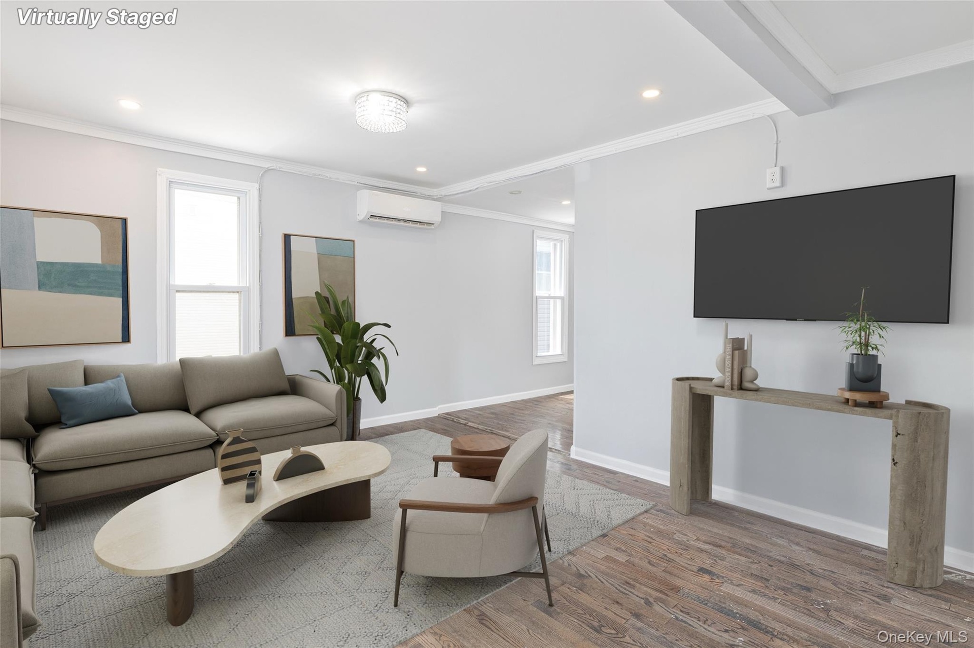 - Living area with a wall unit AC, plenty of natural light, wood finished floors, ornamental molding, and recessed lighting