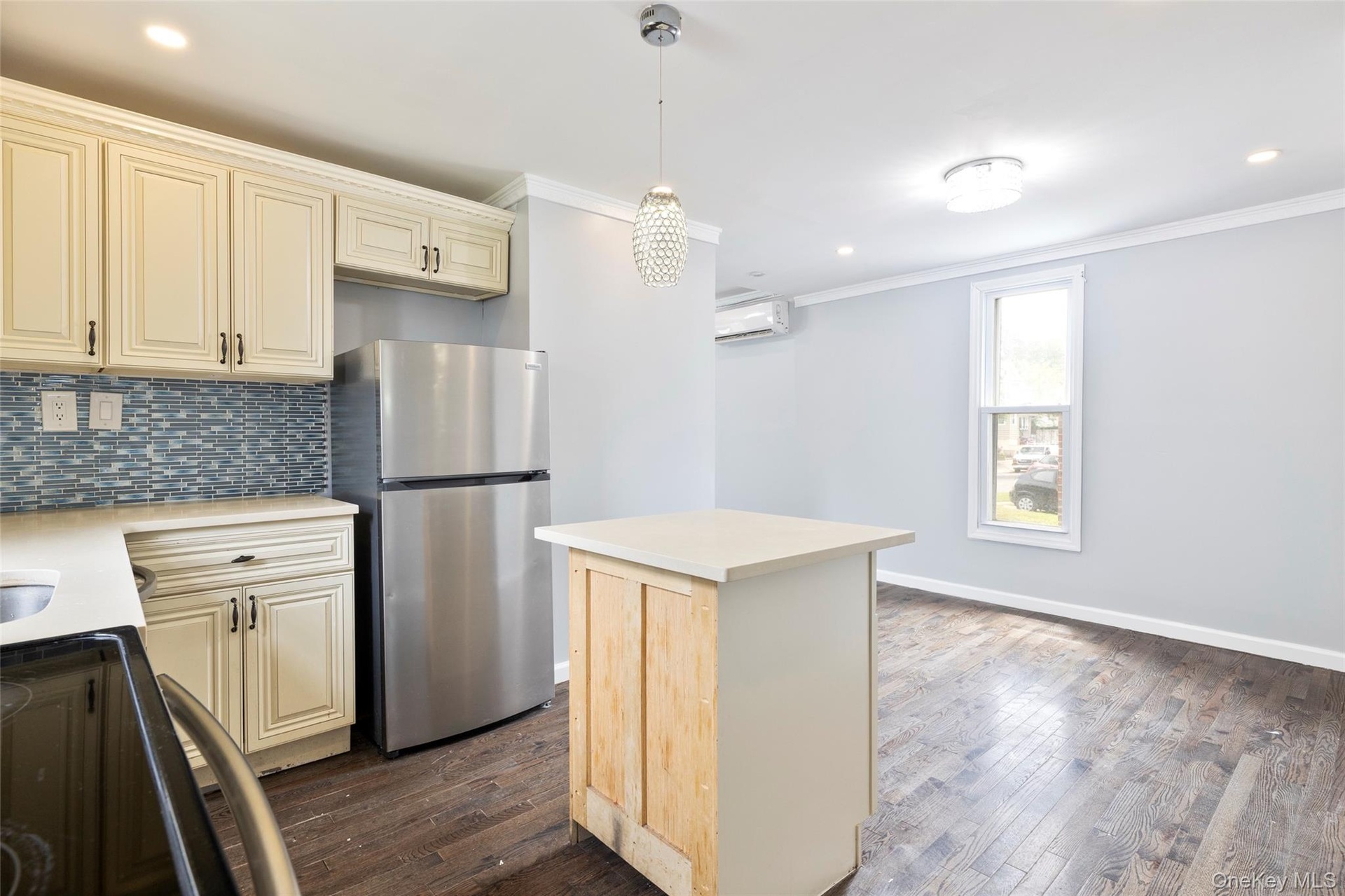 - Kitchen featuring freestanding refrigerator, cream cabinetry, a wall mounted AC, light countertops, and ornamental molding
