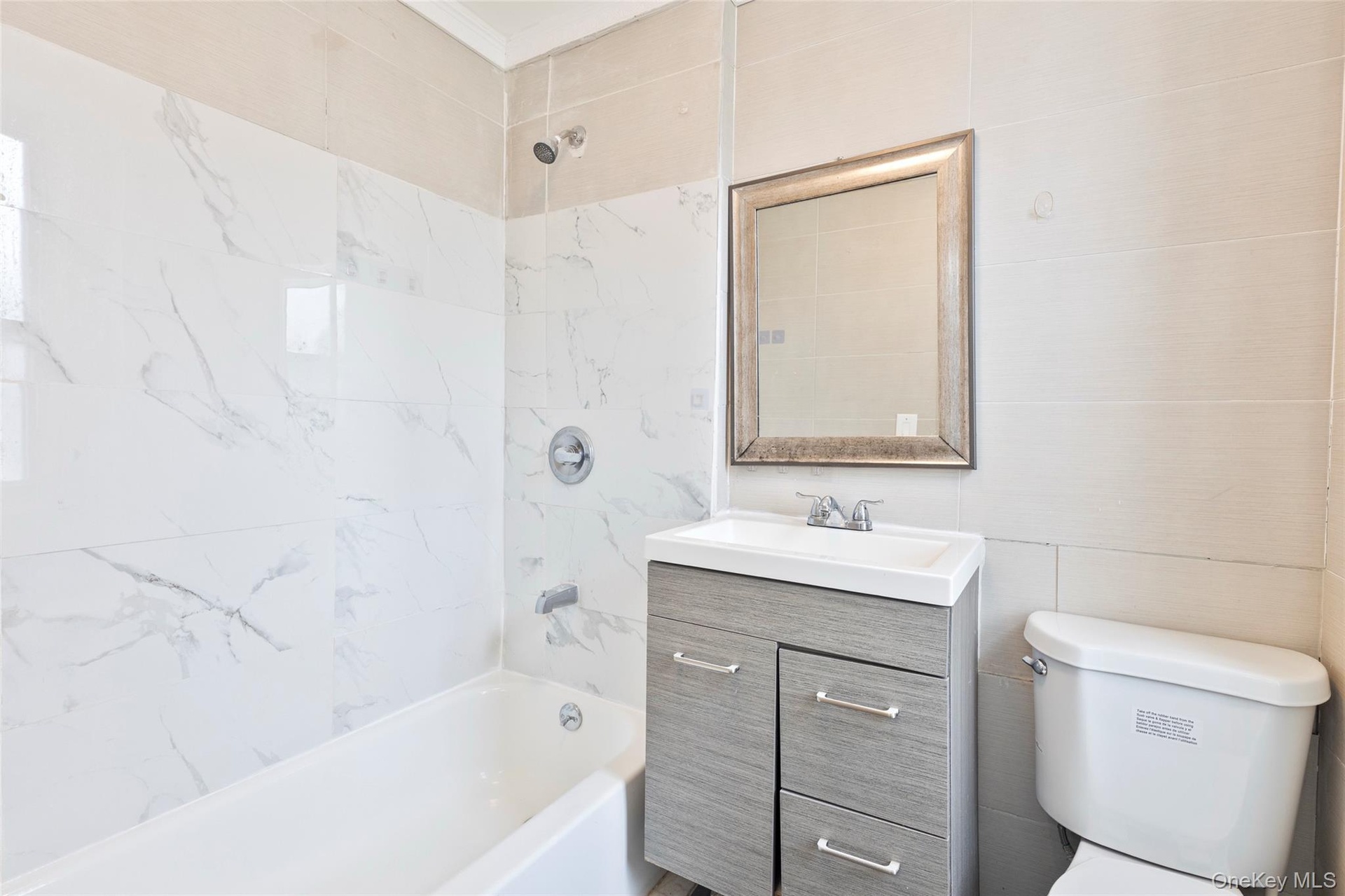 - Bathroom featuring vanity, shower / tub combination, and tile walls