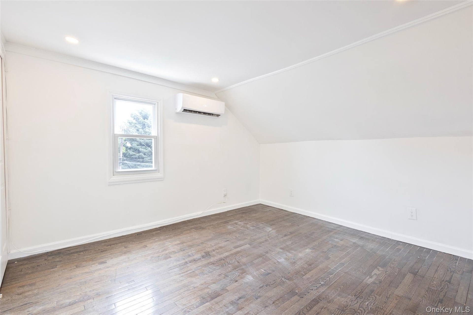 - Additional living space with an AC wall unit, wood-type flooring, vaulted ceiling, and recessed lighting