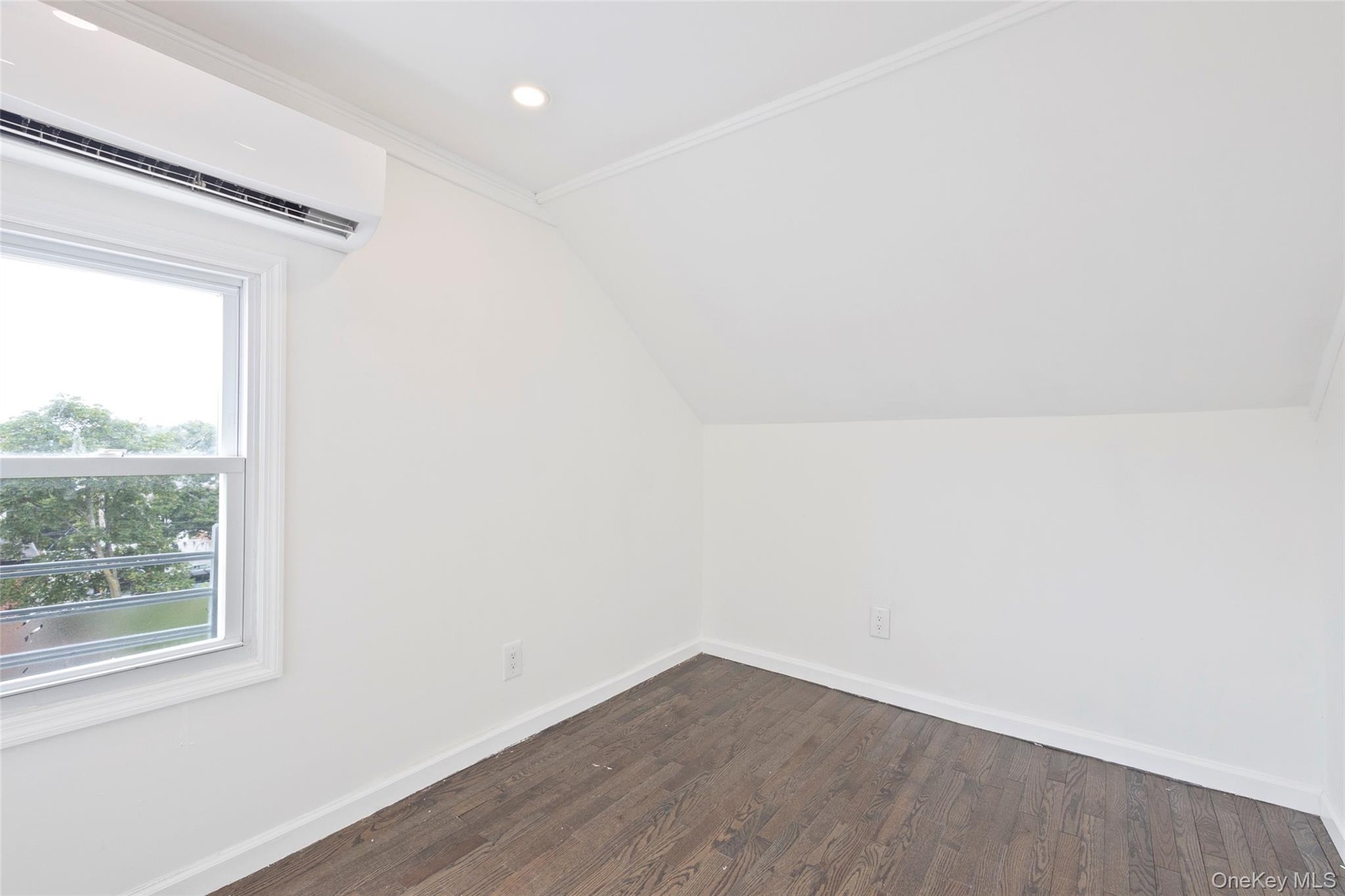 - Bonus room with a wall mounted AC, dark wood-style flooring, vaulted ceiling, and recessed lighting