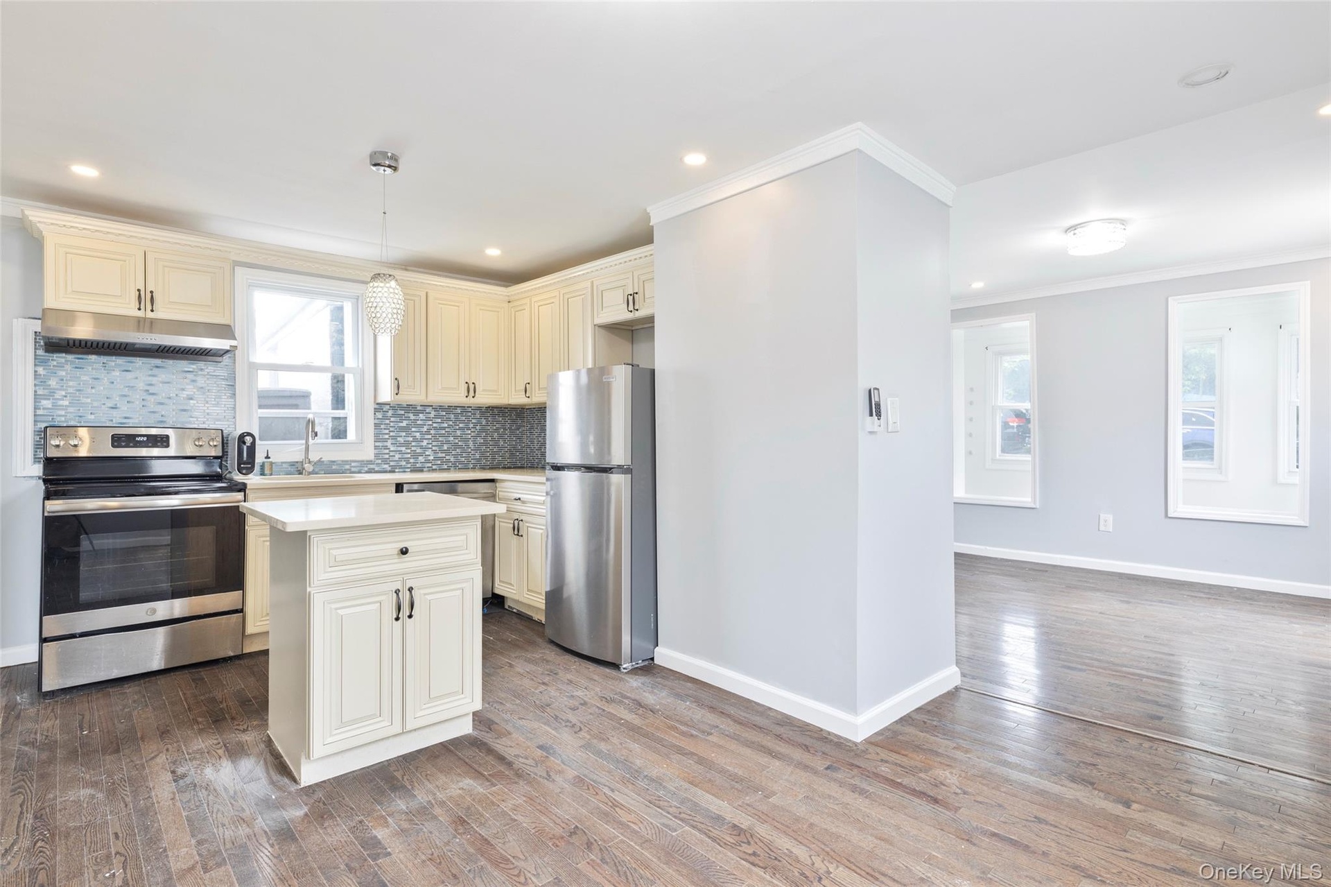 - Kitchen with stainless steel appliances, under cabinet range hood, cream cabinetry, backsplash, and wood finished floors