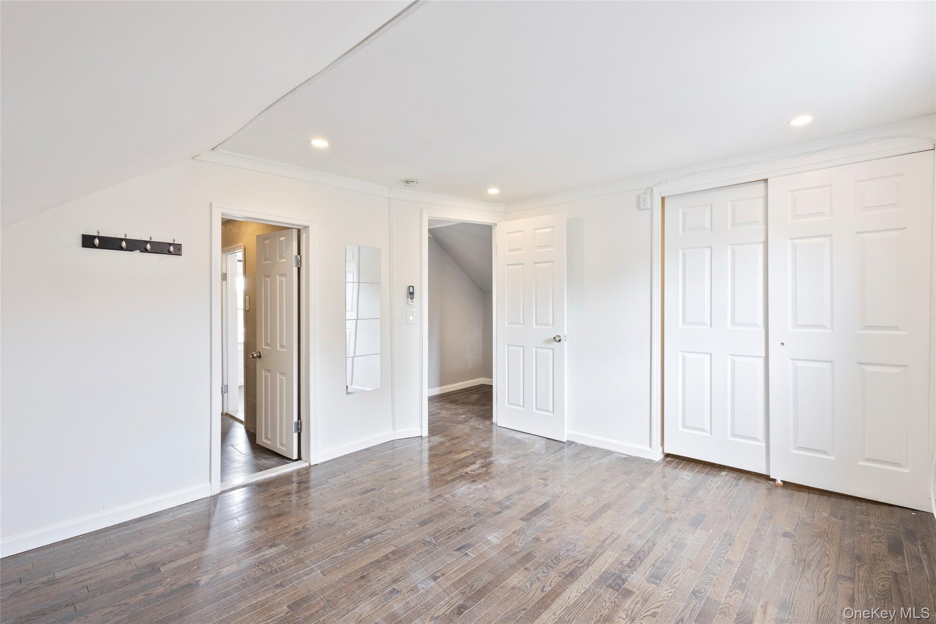 - Unfurnished bedroom with wood finished floors, a closet, recessed lighting, and ornamental molding