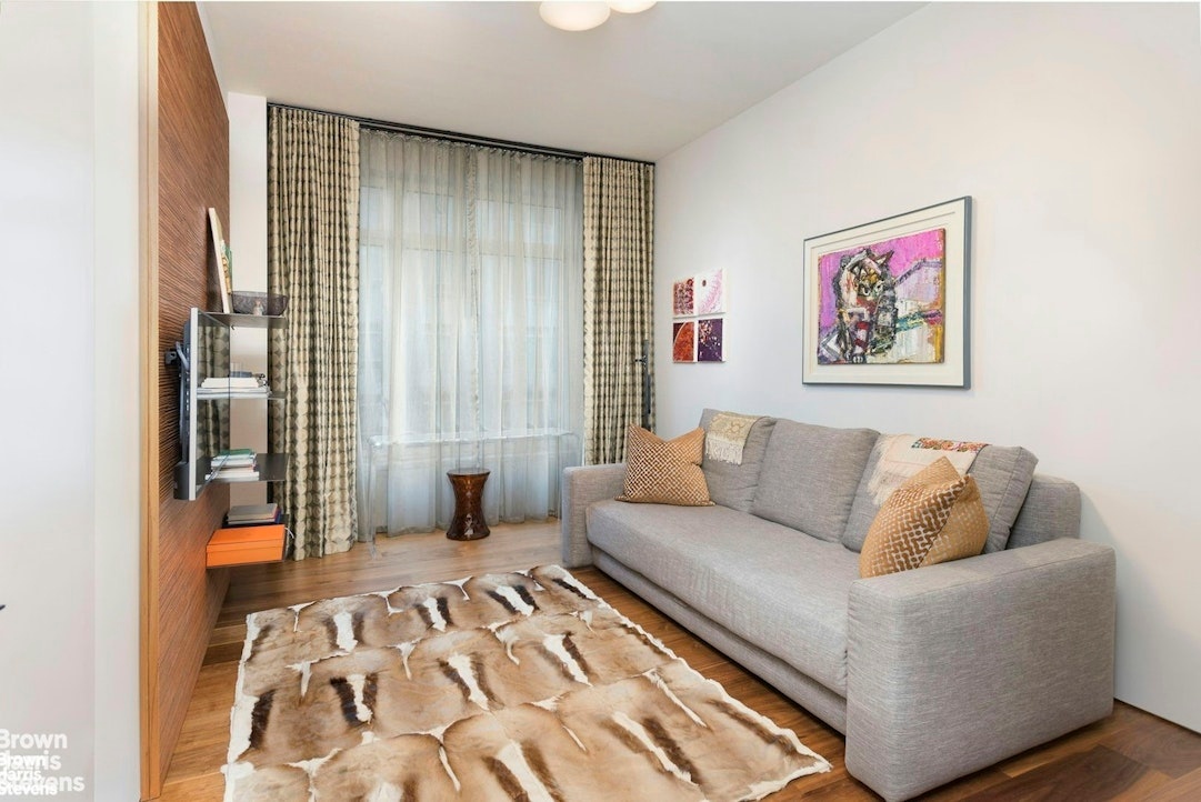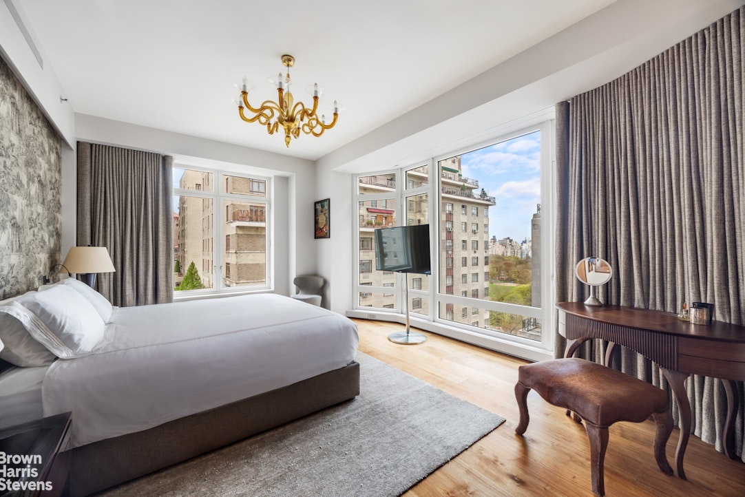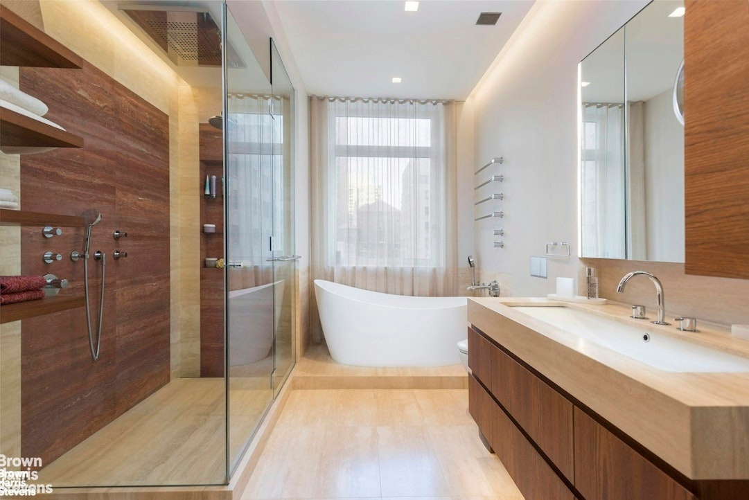 Two bedrooms and a sitting room, easily able to be converted back to a third bedroom, have been thoughtfully tucked away in the east wing of this impressive residence. The primary bedroom occupies the prime east-facing corner, allowing for double exposures and treetop views of Central Park. The sitting room is connected to the primary bedroom with full-height solid walnut doors and is currently configured as a home office bedecked with built-in walnut cabinetry and shelving. Completing this all-encompassing primary suite is the primary bathroom outfitted in Ivory and Persian Sunset Travertine with a walnut clad vanity, reminiscent of the colors and textures found in nature to provide a serene at home spa experience. An oversized soaking tub sits picturesquely under a Park facing window while a glass encased spa shower with dual shower heads is tucked off to the side. Radiant heated floors and heated towel racks complete this space.