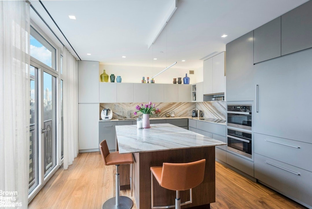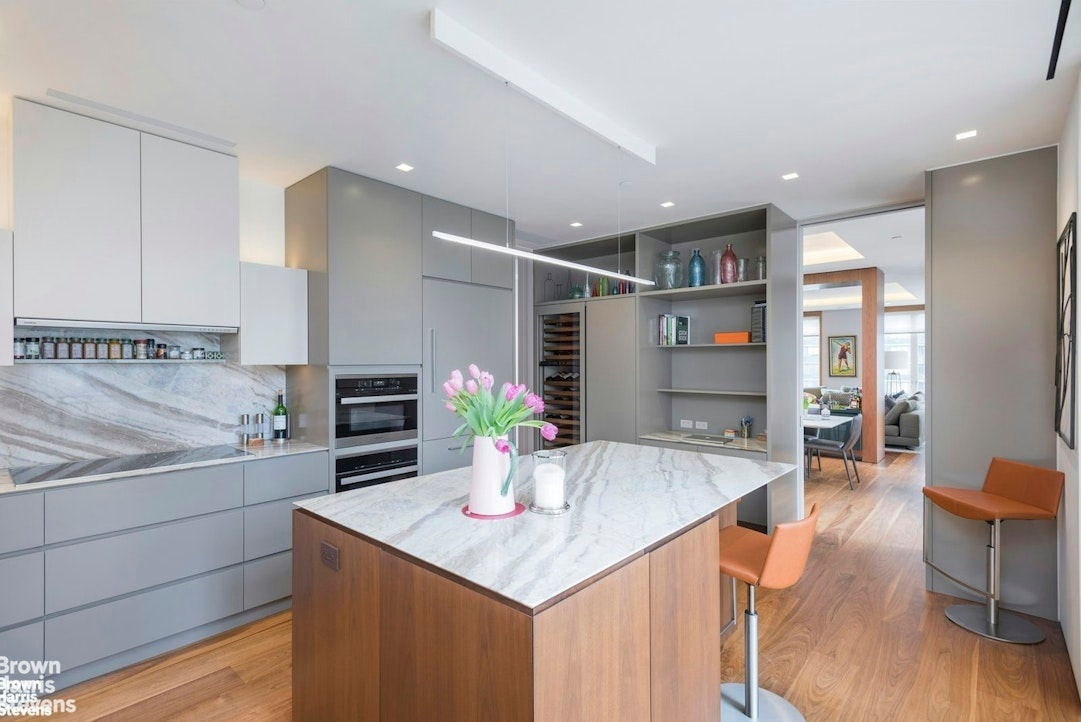 Residence 15K" s chef's kitchen, accessible from both the dining room and grand foyer, is appointed with Miele & Sub-Zero appliances, including an induction cooktop, oven with steam, convection, and traditional capabilities as well as a full size Miele 50-bottle wine refrigerator. Stone countertops and backsplash in the same subtle earth driven colors found in the living and dining rooms continue to bring the inspiration of Central Park indoors, further complemented by the walnut hardwood floors found throughout.