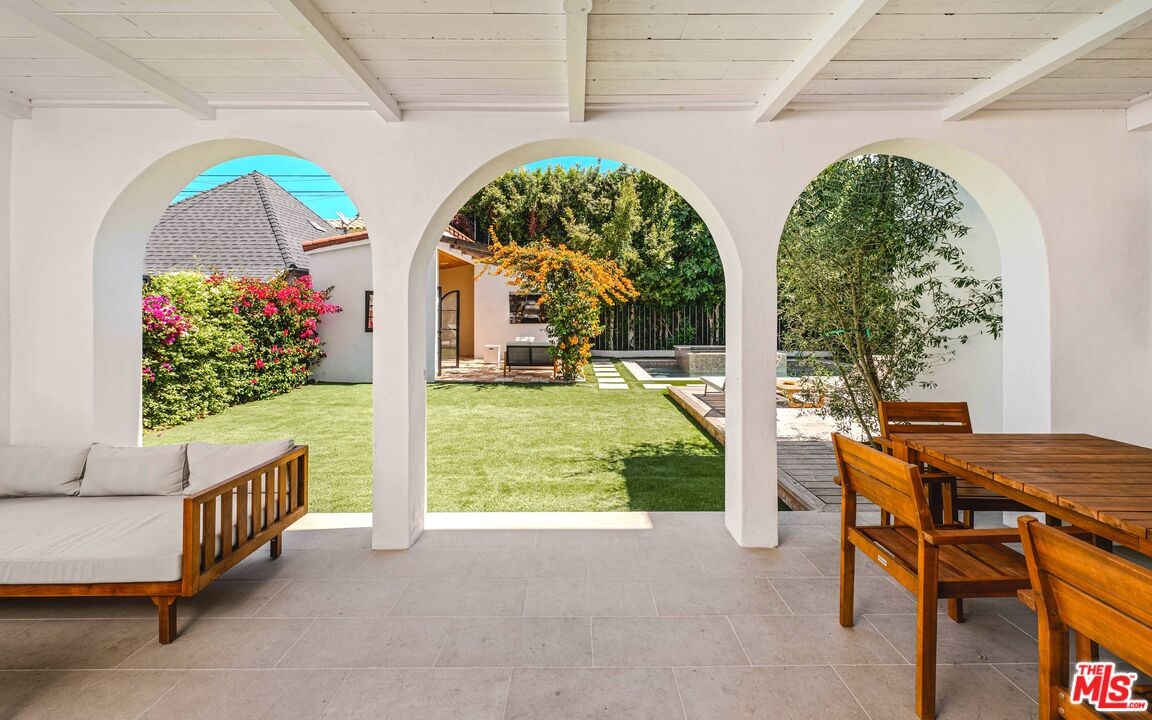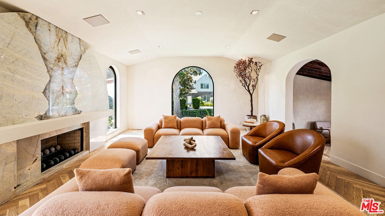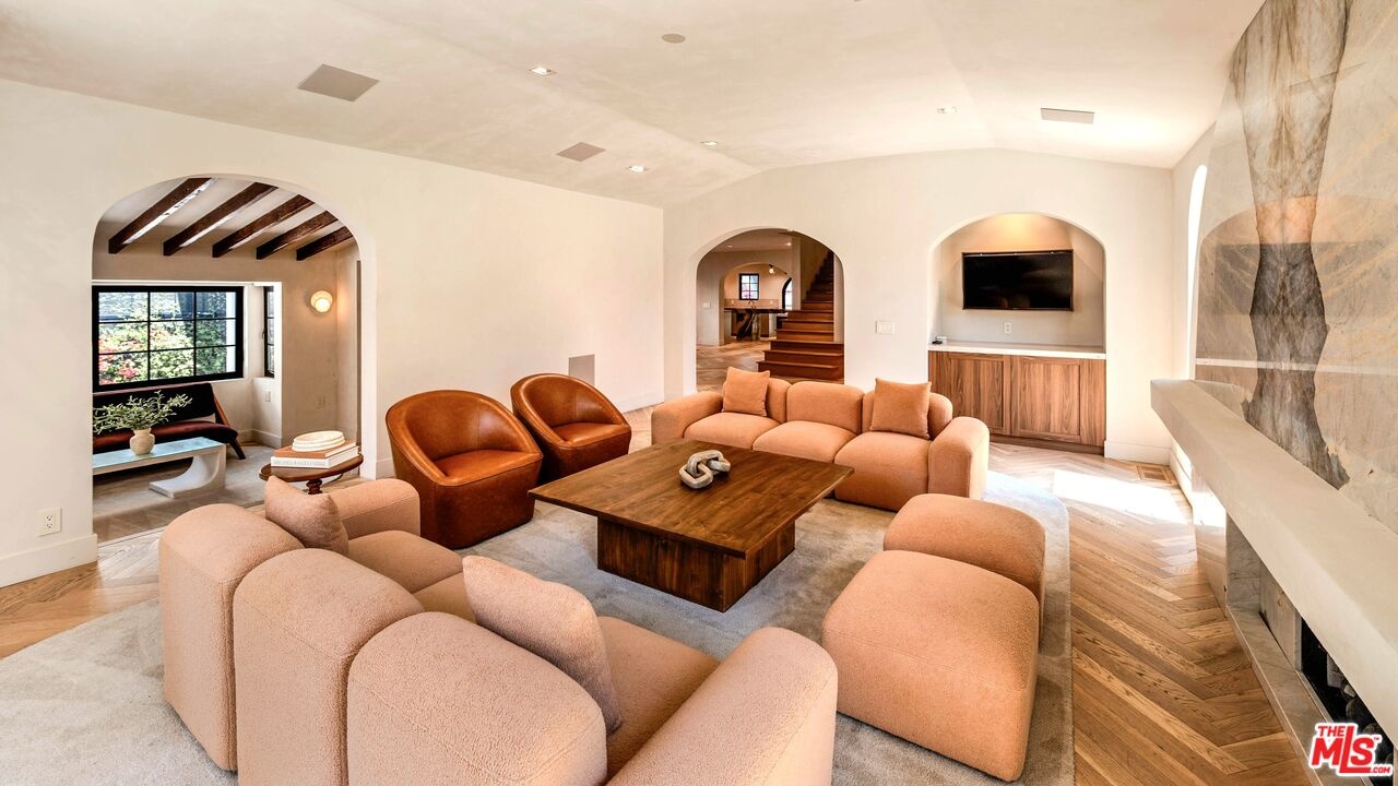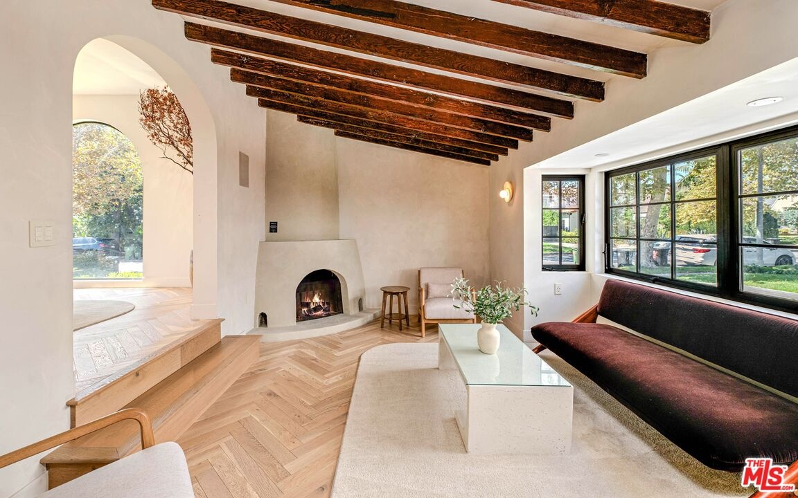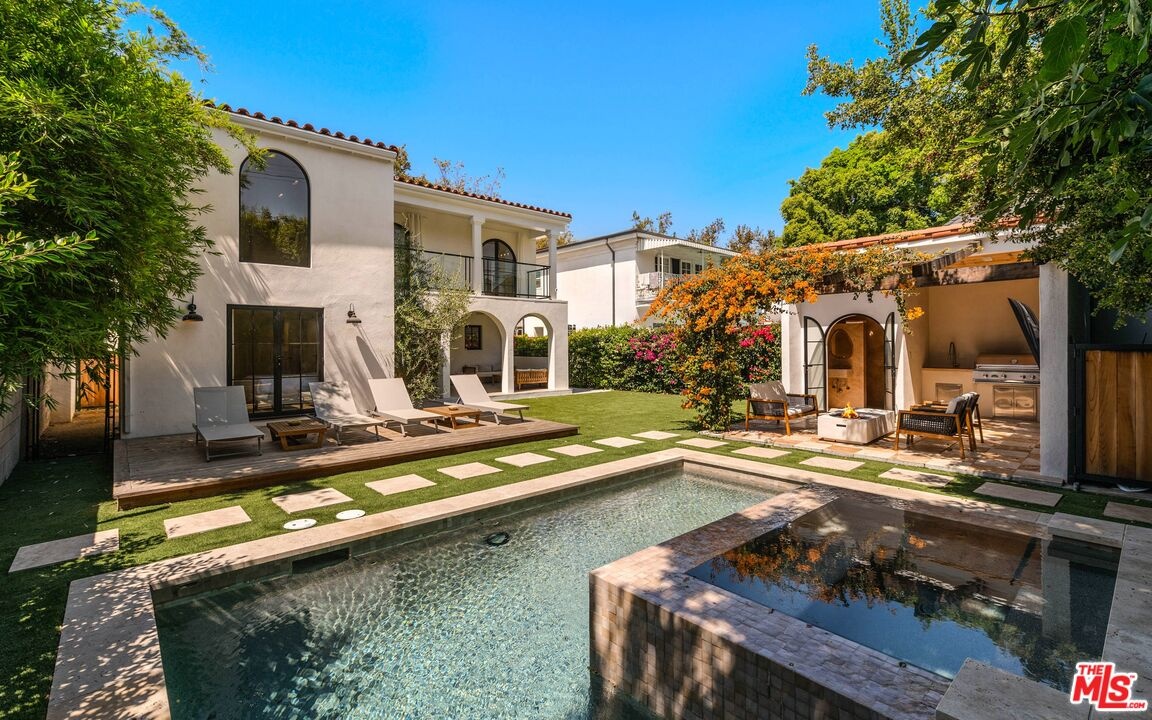 Welcome to this timeless 4-bed, 5-bath Spanish villa, just minutes from Hancock Park. Thoughtfully designed with plastered walls, graceful arches, and light-filled interiors, the home offers a seamless flow: a guest suite downstairs, three en-suite bedrooms upstairs, plus a versatile bonus room. The primary suite is a true retreat with a spa-like bath and oversized walk-in closet, while the chef's kitchen impresses with dual refrigerators, dual dishwashers, and top-tier appliances. Step outside to your private sanctuary complete with pool, spa, built-in BBQ, outdoor shower, fireplace, and TV perfect for effortless year-round entertaining. A fully integrated smart-home system puts everything at your fingertips, blending authentic Spanish charm with modern convenience in one of LA's most coveted locations.