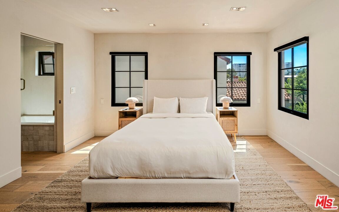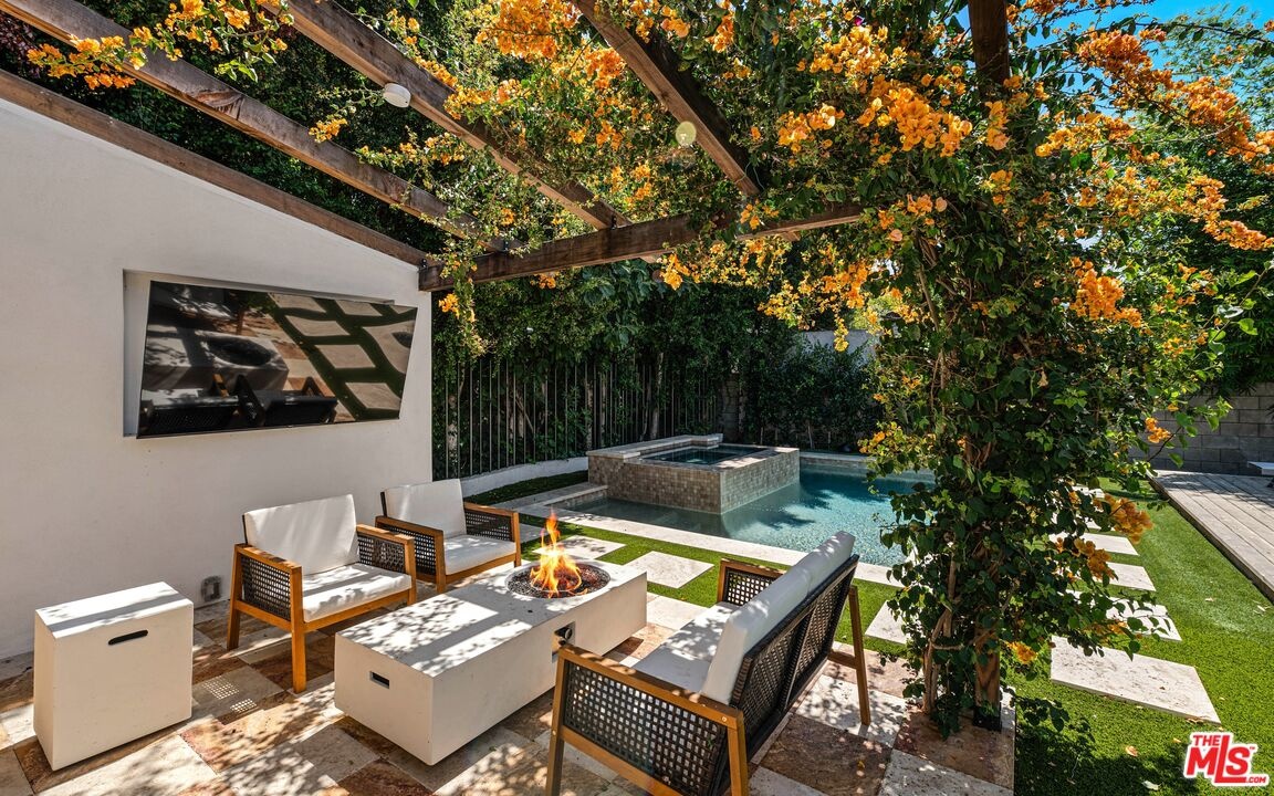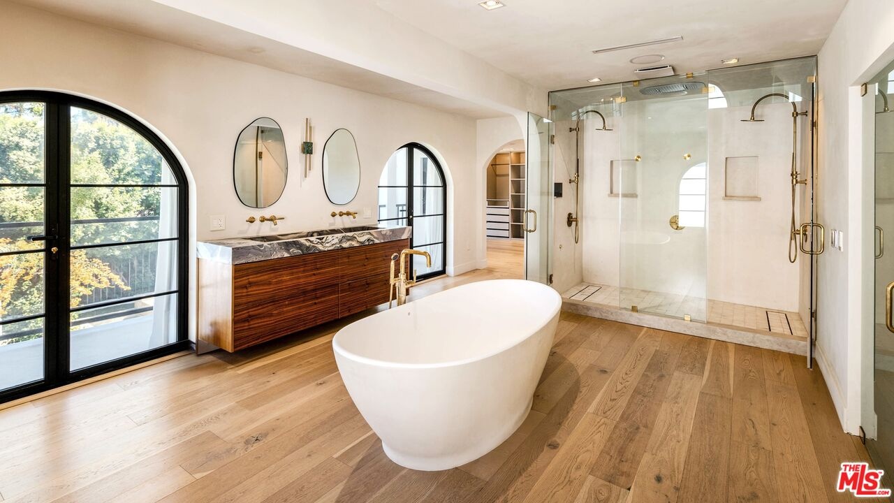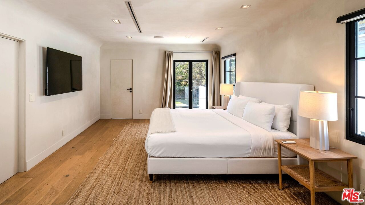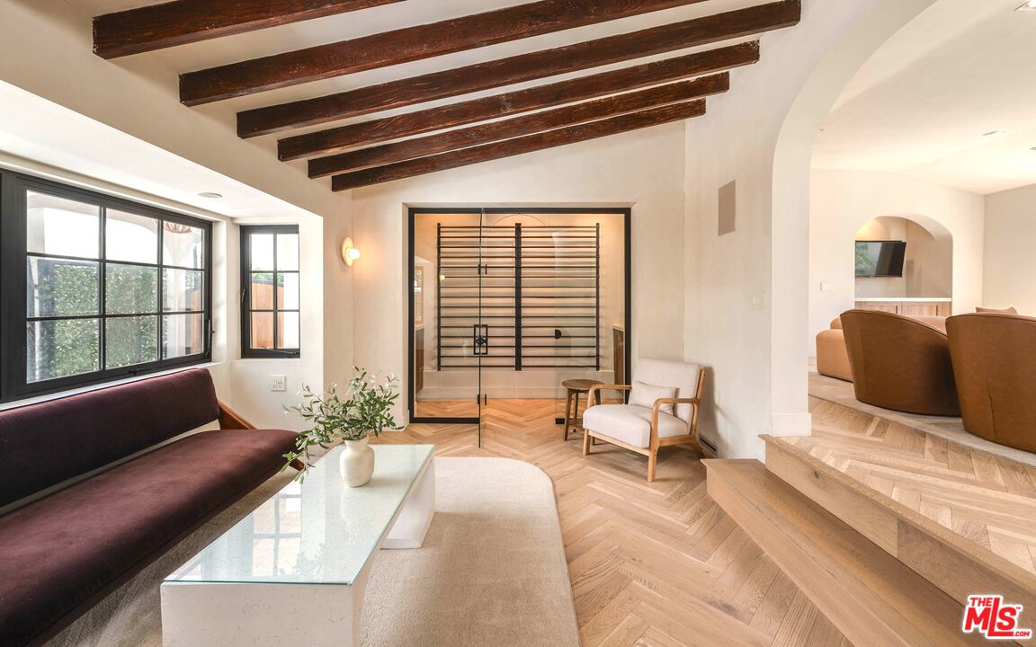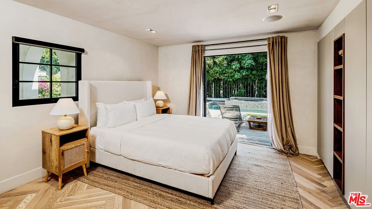 Welcome to this timeless 4-bed, 5-bath Spanish villa, just minutes from Hancock Park. Thoughtfully designed with plastered walls, graceful arches, and light-filled interiors, the home offers a seamless flow: a guest suite downstairs, three en-suite bedrooms upstairs, plus a versatile bonus room. The primary suite is a true retreat with a spa-like bath and oversized walk-in closet, while the chef's kitchen impresses with dual refrigerators, dual dishwashers, and top-tier appliances. Step outside to your private sanctuary complete with pool, spa, built-in BBQ, outdoor shower, fireplace, and TV perfect for effortless year-round entertaining. A fully integrated smart-home system puts everything at your fingertips, blending authentic Spanish charm with modern convenience in one of LA's most coveted locations.