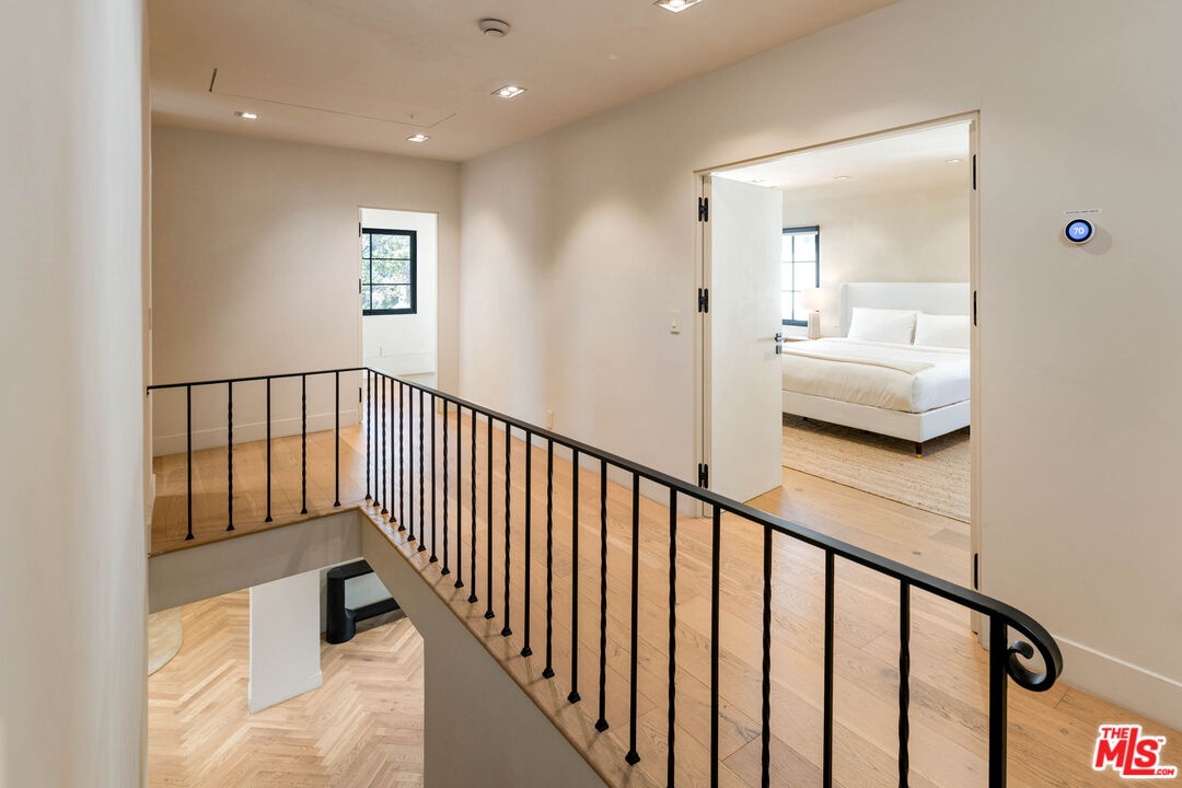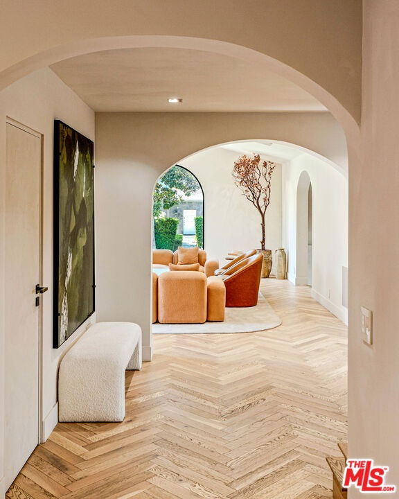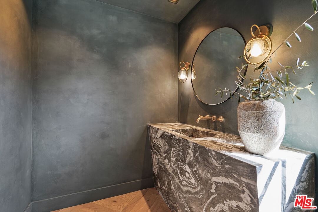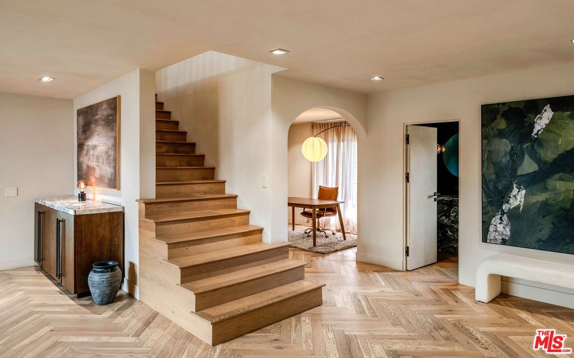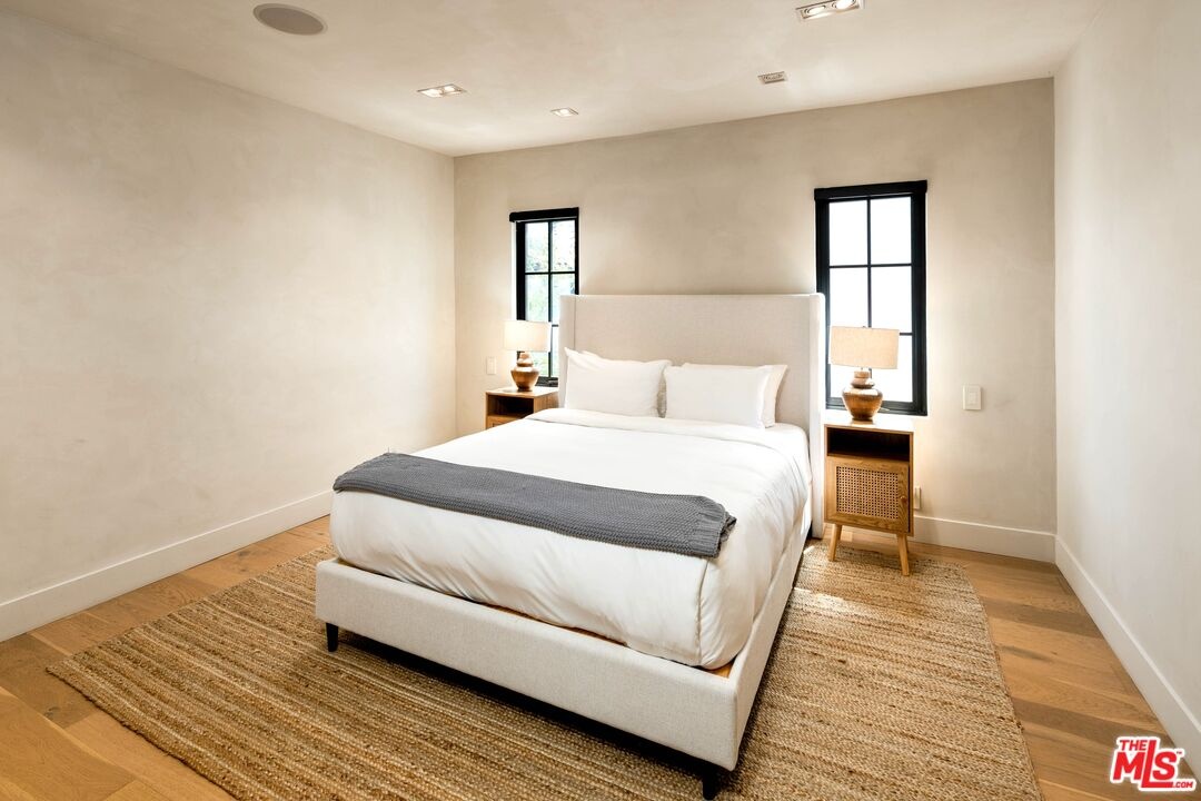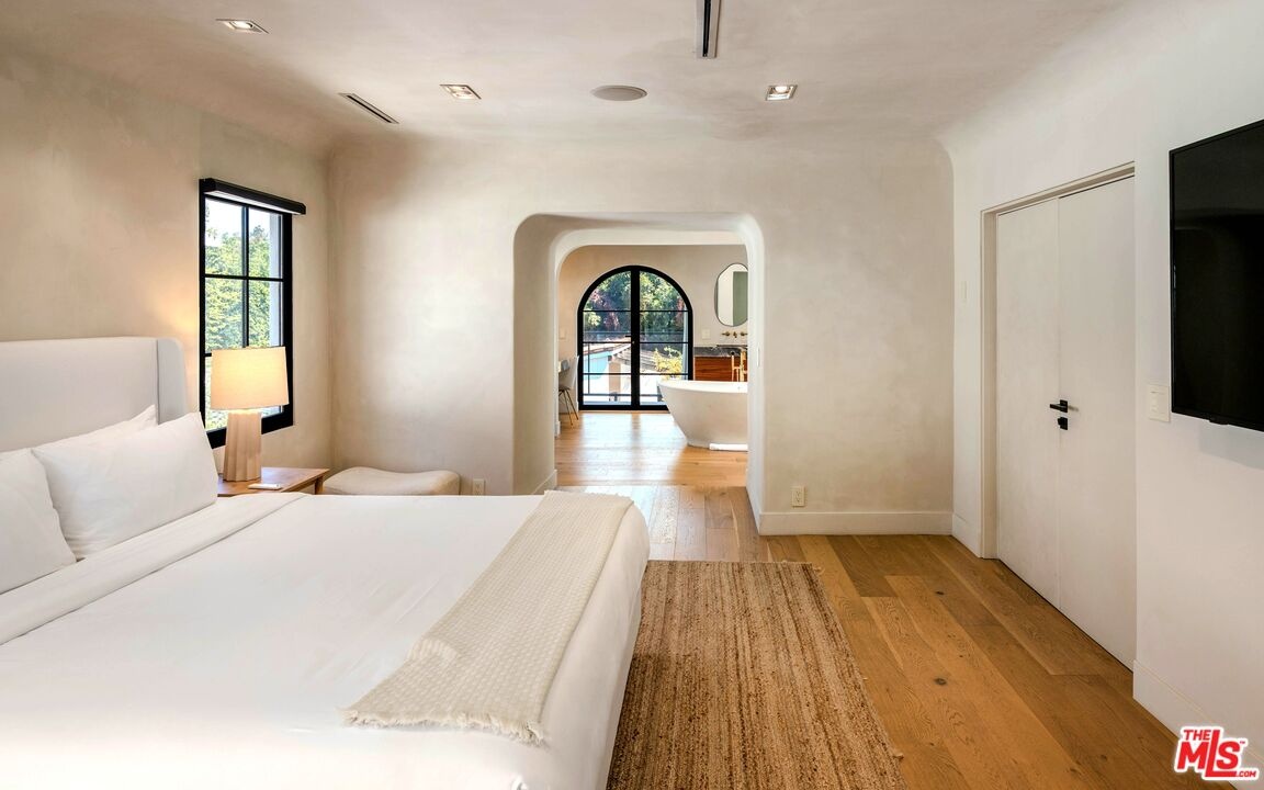 Welcome to this timeless 4-bed, 5-bath Spanish villa, just minutes from Hancock Park. Thoughtfully designed with plastered walls, graceful arches, and light-filled interiors, the home offers a seamless flow: a guest suite downstairs, three en-suite bedrooms upstairs, plus a versatile bonus room. The primary suite is a true retreat with a spa-like bath and oversized walk-in closet, while the chef's kitchen impresses with dual refrigerators, dual dishwashers, and top-tier appliances. Step outside to your private sanctuary complete with pool, spa, built-in BBQ, outdoor shower, fireplace, and TV perfect for effortless year-round entertaining. A fully integrated smart-home system puts everything at your fingertips, blending authentic Spanish charm with modern convenience in one of LA's most coveted locations.