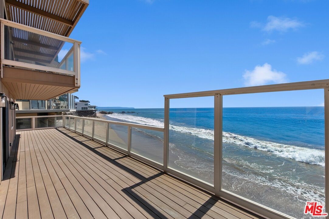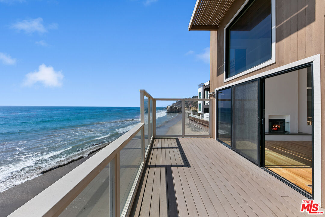 Experience beachfront living at its finest on one of Malibu's most picturesque stretches of sandy coastline. Located in a gated community with a private driveway, this home captures sweeping ocean and whitewater views, with vistas of the dramatic rock formations at El Matador Beach and far beyond. The living room is an entertainer's dream, featuring soaring ceilings, a wet bar with a wine fridge, a fireplace, and floor-to-ceiling windows gazing over the waves below. Sliding glass doors open to an expansive ~50-foot sun deck with 180-degree views of rocky outcroppings and passing sea life. The kitchen offers an island with bar seating, stainless steel appliances, and seamless flow into the dining area and den, with a second fireplace for cozy seaside evenings. Upstairs, the primary suite spans the front of the home with serene views in every direction. Two sets of sliding doors open to a private oceanfront balcony, while the en-suite bathroom features dual vanities and a walk-in closet. Two additional bedrooms, a full bathroom, and a powder room provide comfortable accommodations for family or guests. At the entry level, a private gate leads directly to the sandy beach and surf below, with nearshore reefs perfect for the ocean enthusiast. A fully enclosed courtyard ensures easy and secure access to the 3-car garage. For those seeking coastal bliss with views from sunrise to sunset, this retreat presents a rare opportunity to live in one of the best locations in all of Malibu. Available now for long-term lease.