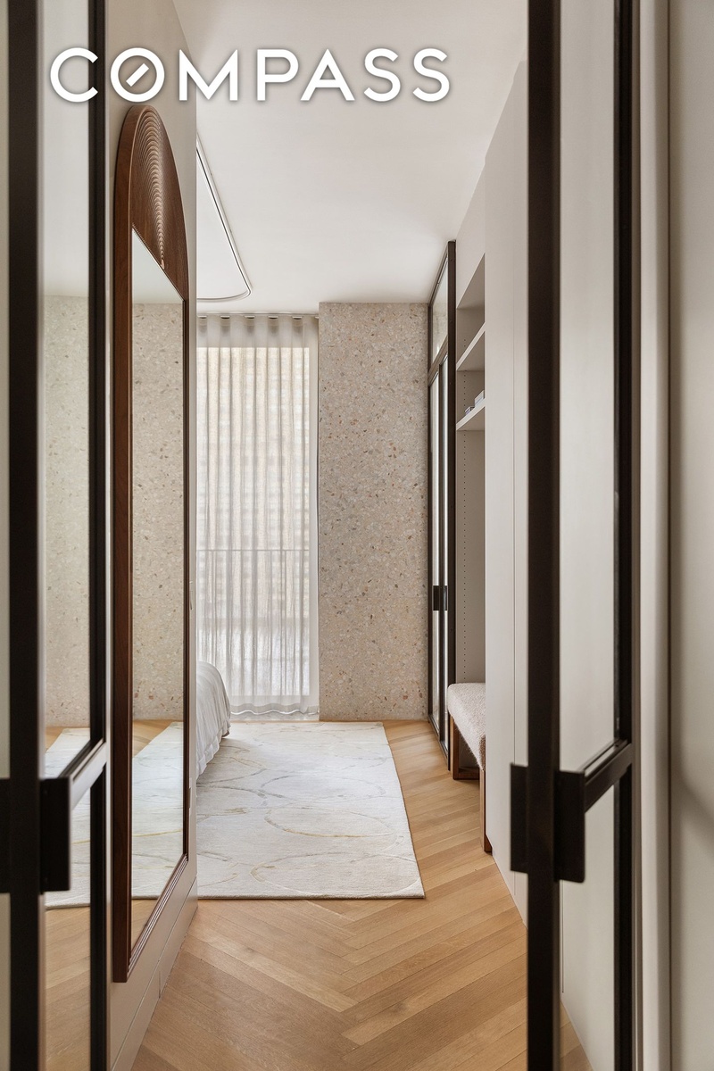 • Finishes: Radiant-heated, white oak herringbone floors meet soft pale terrazzo accents, complemented by Farrow & Ball-painted walls and millwork for a muted, timeless elegance.