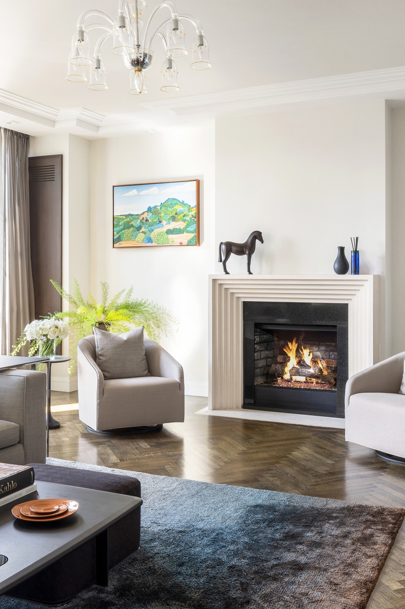 The elevator opens directly into the handsome foyer which serves as the nexus for all parts of the home. The expansive living room overlooks landmarked buildings on Park Avenue through floor to ceiling windows and French doors that open to an exquisite Juliet balcony. It also boasts 10’ ceiling heights, a chic gas fireplace, and beautiful herringbone wood flooring. Across the foyer sits the dining room, featuring discreet custom cabinetry. Sleek and polished, the windowed chef’s kitchen boasts a suite of Miele and Sub-Zero appliances, Poliform cabinetry, and can be closed off with a pocket door. Rounding out the bottom floor is a large marble-clad powder room and a coat closet.
