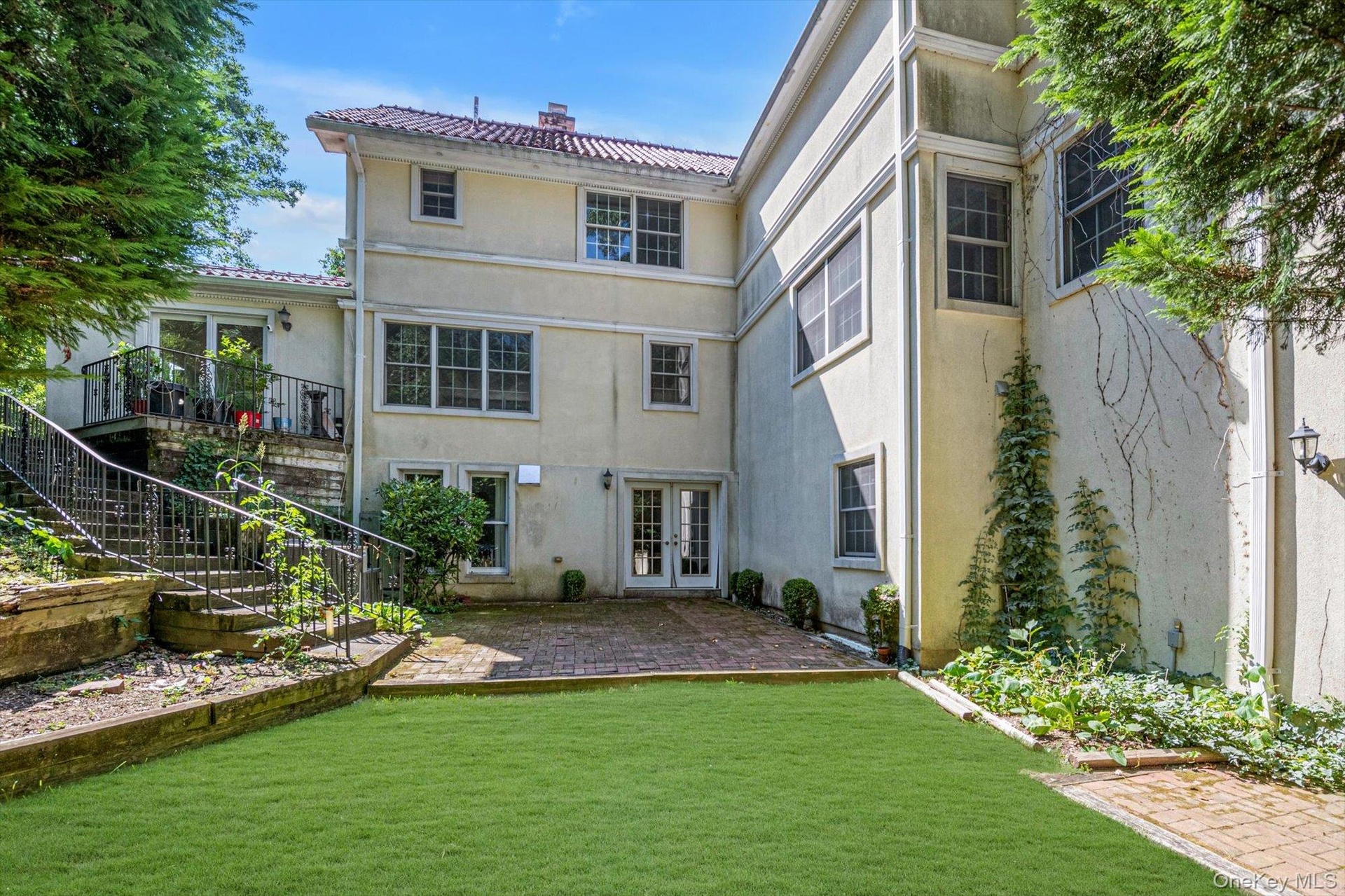 - Back of property featuring french doors, stairs, stucco siding, a chimney, and a patio area
