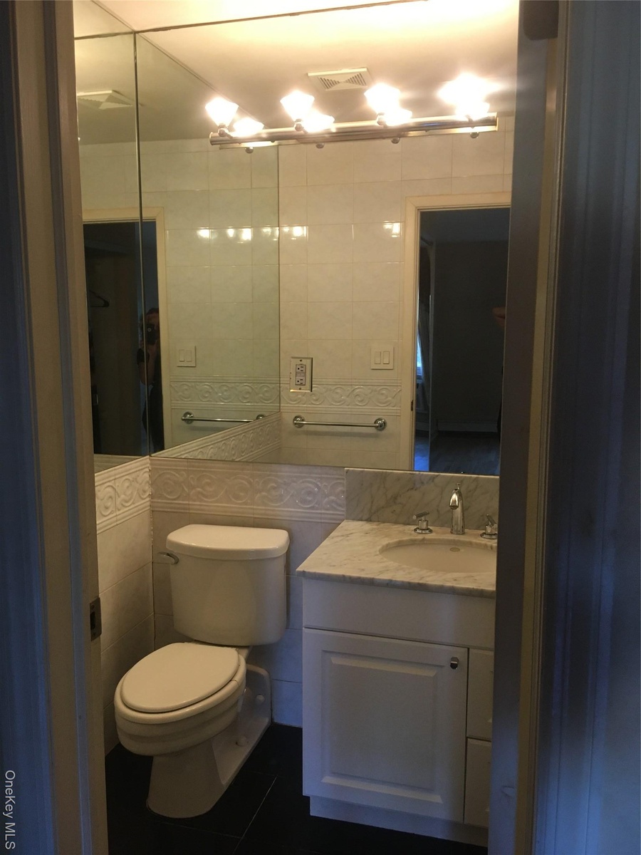 - Bathroom featuring tile walls, vanity, dark tile patterned flooring, and backsplash