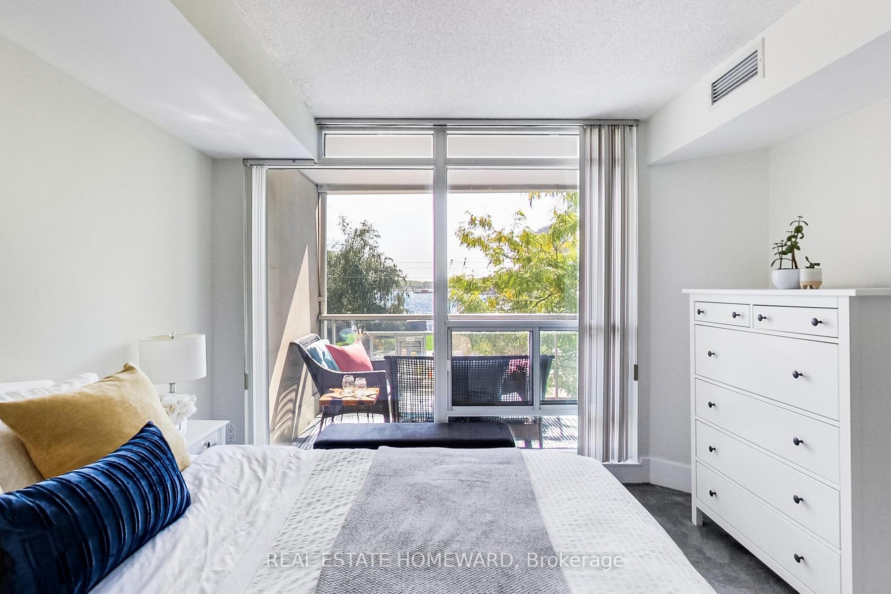 Live by the Lake in this Highly Sought After, Mid-Rise Boutique Building on the Waterfront. This Rarely Offered Layout is truly South-Facing with an unobstructed view of the Lake, park, trail. With an Open Concept, Bright + Spacious Floor Plan + Floor to Ceiling Windows along with a Spacious and Private Balcony, you'll love living here. The generous Primary Bedroom - King-Size Bed ready, has a spacious walk-in closet and entrance to Bath (note: Separate 2-piece for extra privacy). All rooms (kitchen/dining/living/bedroom have a great view). The privacy of the balcony is extra special (adding 66 sq ft of lifestyle space). The Unit also comes with 1 parking spot and 1 locker. What the Sellers (who have outgrown the space) love most about their UNIT: 1. View of the Lake. 2. Island in the Kitchen. 3. Large Bedroom. 4. Balcony is a good size. 5. Extra bathroom sink with a 2nd entrance through Bedroom. 6. Primary parking spot. 7. Easy access to the stairs. The LOCATION: 1. Water + TTC at our doorstep with the Streetcar having a designated lane that goes right to Union. 2. Walking/Running/Cycling the waterfront trail. 3. Walking distance to Rogers Center, Scotiabank Arena, Bud Stage, King West, Water Taxis to the Island, Walk-in clinic next door, Billy Bishop Airport, 3 grocery stores + Shoppers Drug Mart. 3. The pedestrian bridge in Garrison park makes it very easy to access numerous neighbourhoods including Queen West, the Ossington strip + Trinity Bellwoods. Liberty Village and the exhibition grounds are also within walking distance. What they love about the CONDO BUILDING: 1. Clean, well-managed + well-maintained. 2. The Rooftop BBQ's + space for lounging/entertaining with an unobstructed view of the Lake + the Toronto city skyline. 3. The Party Room is a great party/event/work from home space. 4. The gym is welcoming, has updated equipment + includes a sauna + steam room. 5. 24-Hour knowledgeable concierge + security is a big perk. 6. Visitor Parking