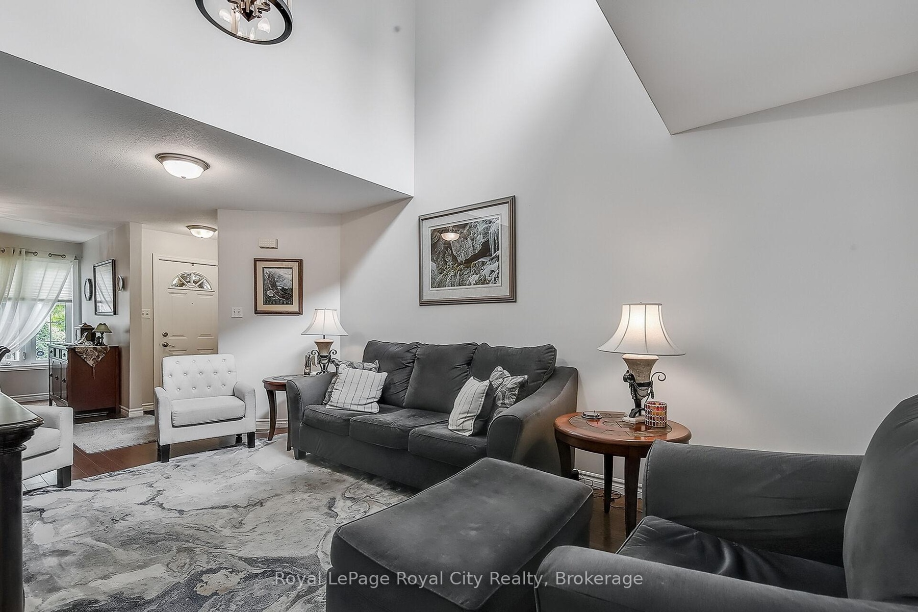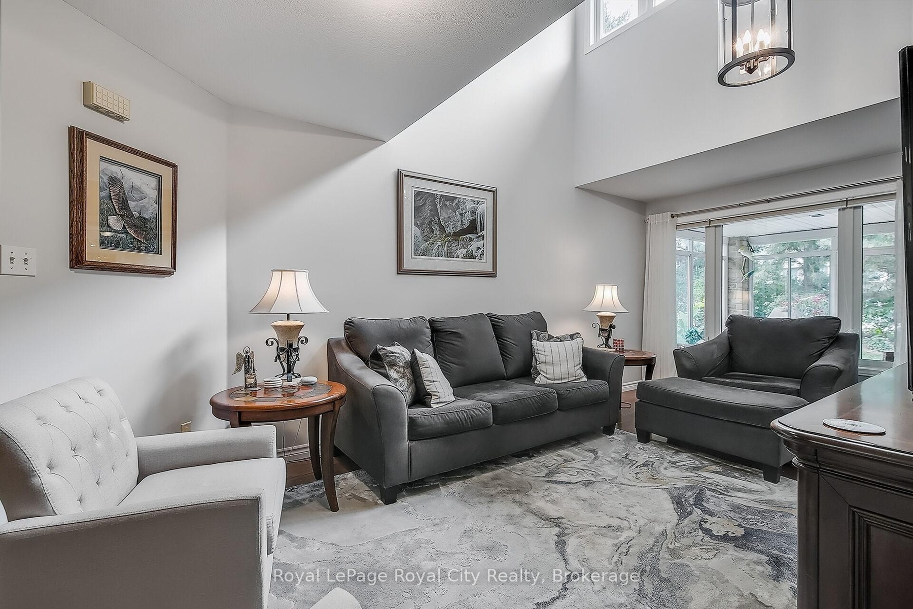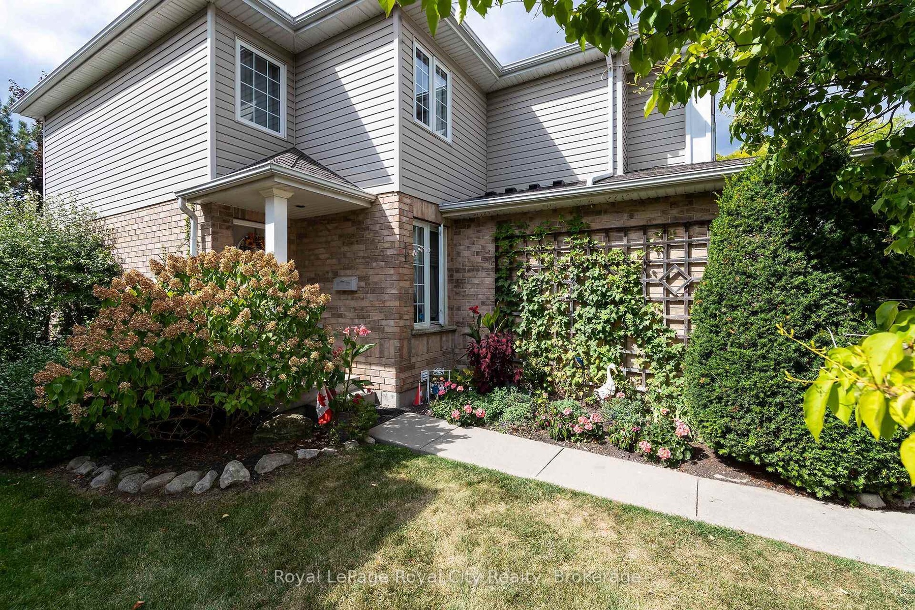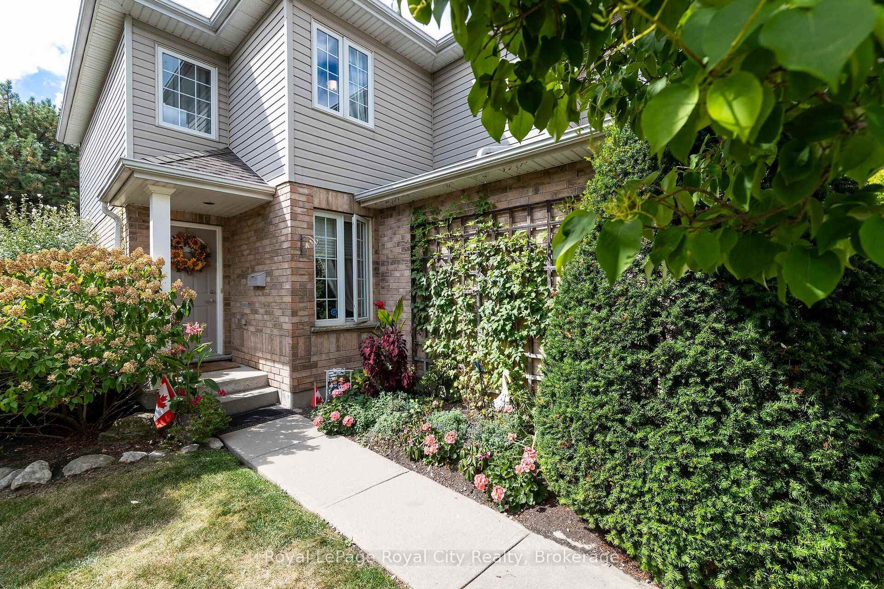 Welcome to The Cottages, a friendly, private, highly desirable enclave that has become a favourite for many. Location is everything, and this home offers the perfect blend of convenience and comfort, just minutes from all the amenities Guelphs south end has to offer. Pride of ownership shines throughout this spacious three-bedroom plus den, 3.5-bathroom home. The bright and inviting living room welcomes you with soaring ceilings, while the updated kitchen features granite countertops, a stylish renovation, and overlooks a warm and cozy family room complete with fireplace. A bonus 3 season sunroom is a great place to start your morning coffee or wind down with a good book at the end of the day. The primary suite is a true retreat, boasting a completely updated ensuite with a fabulous walk-in glass shower. Solid oak hardwood flooring has been added to both the main and upper levels, giving the home a timeless, elegant feel. Freshly painted and move-in ready, every detail has been carefully maintained. Additional highlights include: Main floor laundry; Two-car garage; Fully finished basement with family room, bedroom, three-piece bath, and generous storage; New granite countertops in both kitchen and baths; Low condo fees that cover everything from the drywall out; Plenty of visitor parking. With its thoughtful updates, inviting layout, and unbeatable location, this home offers the low-maintenance lifestyle you've been waiting for without compromise.