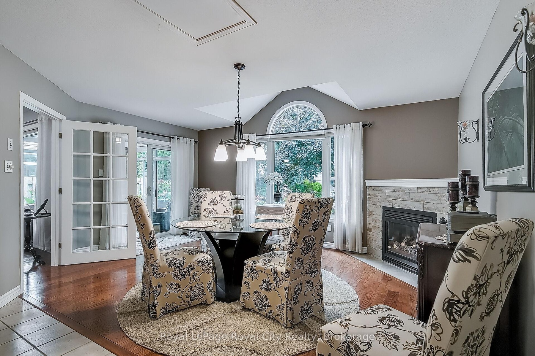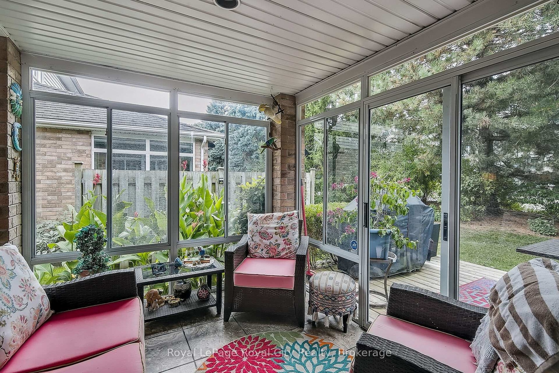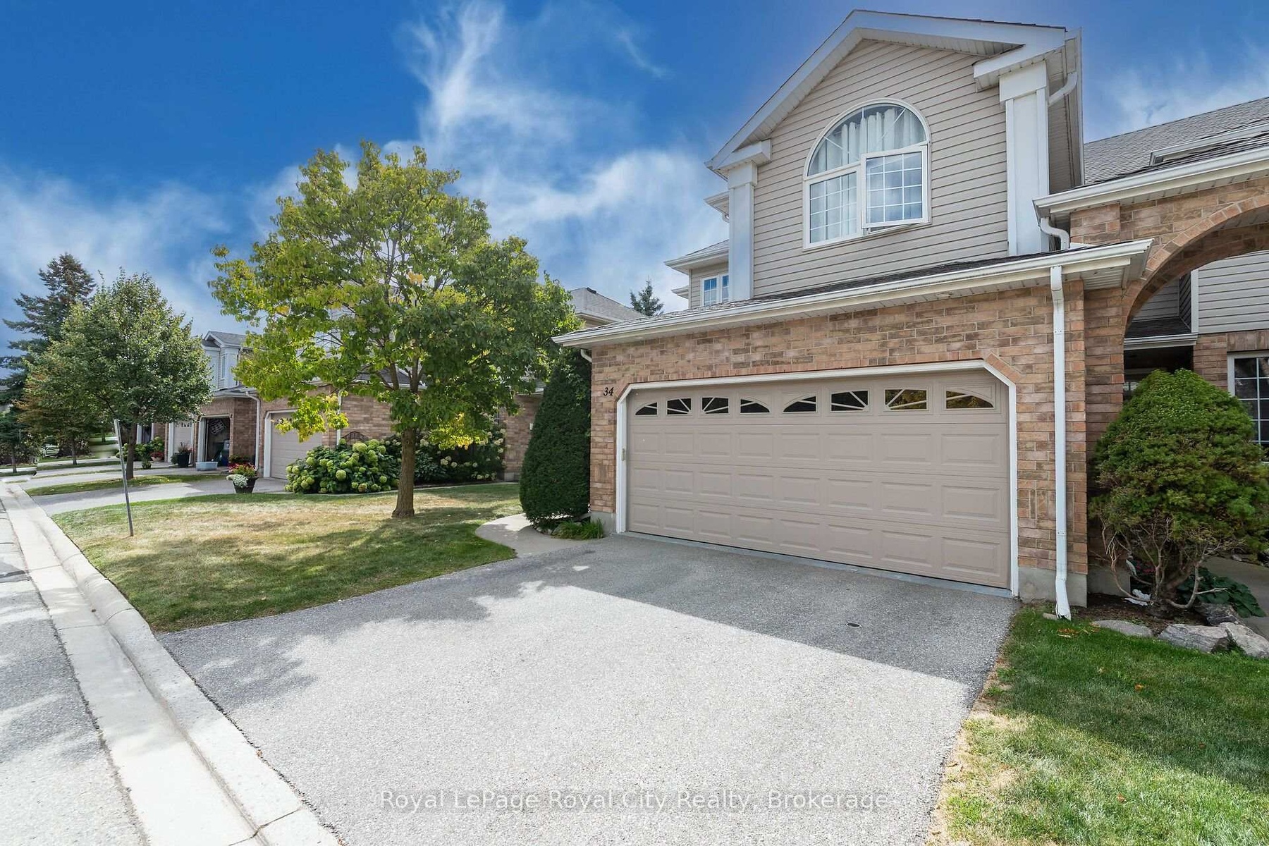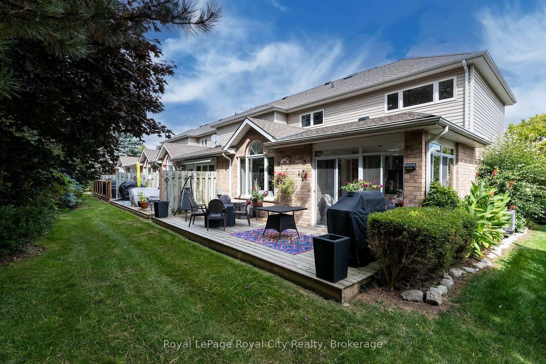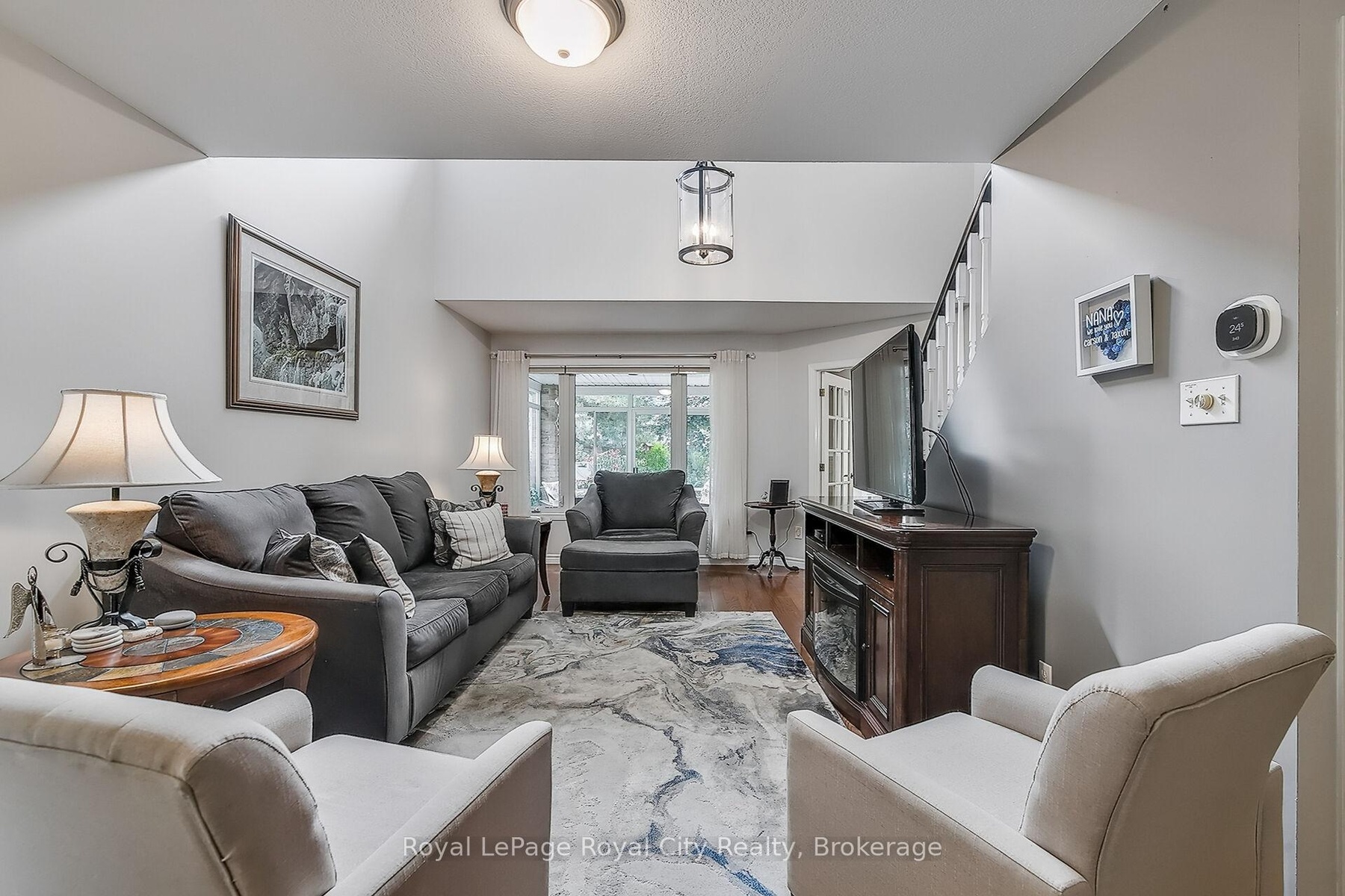Welcome to The Cottages, a friendly, private, highly desirable enclave that has become a favourite for many. Location is everything, and this home offers the perfect blend of convenience and comfort, just minutes from all the amenities Guelphs south end has to offer. Pride of ownership shines throughout this spacious three-bedroom plus den, 3.5-bathroom home. The bright and inviting living room welcomes you with soaring ceilings, while the updated kitchen features granite countertops, a stylish renovation, and overlooks a warm and cozy family room complete with fireplace. A bonus 3 season sunroom is a great place to start your morning coffee or wind down with a good book at the end of the day. The primary suite is a true retreat, boasting a completely updated ensuite with a fabulous walk-in glass shower. Solid oak hardwood flooring has been added to both the main and upper levels, giving the home a timeless, elegant feel. Freshly painted and move-in ready, every detail has been carefully maintained. Additional highlights include: Main floor laundry; Two-car garage; Fully finished basement with family room, bedroom, three-piece bath, and generous storage; New granite countertops in both kitchen and baths; Low condo fees that cover everything from the drywall out; Plenty of visitor parking. With its thoughtful updates, inviting layout, and unbeatable location, this home offers the low-maintenance lifestyle you've been waiting for without compromise.