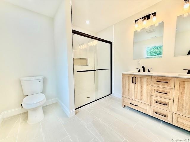 - Full bathroom with a shower stall, double vanity, and recessed lighting