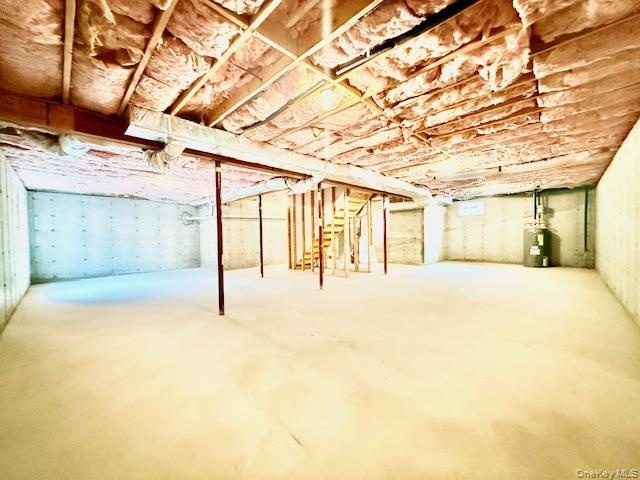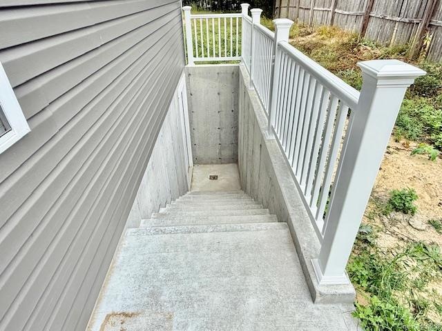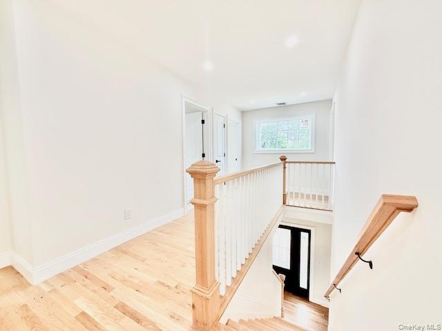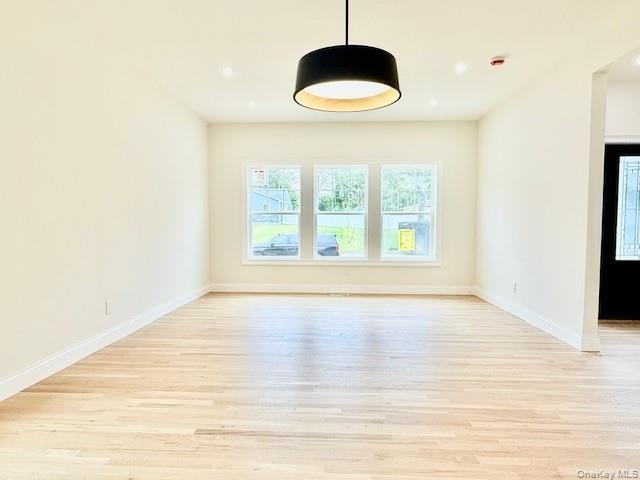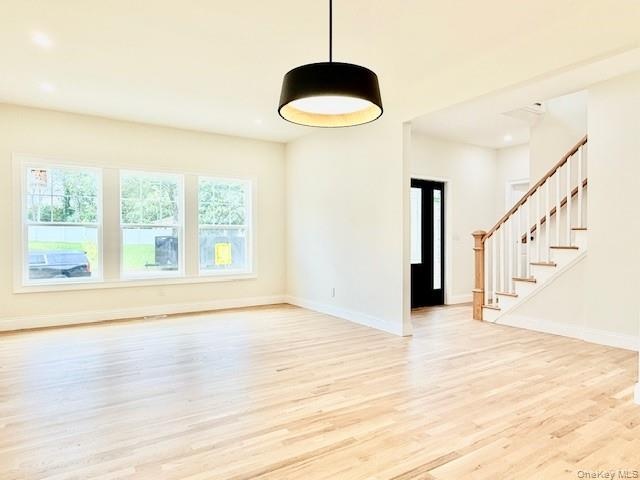 - Unfurnished living room with light wood-style flooring, recessed lighting, and stairway