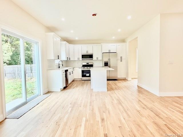 - Kitchen featuring backsplash, white cabinets, stainless steel appliances, light wood-type flooring, and open floor plan