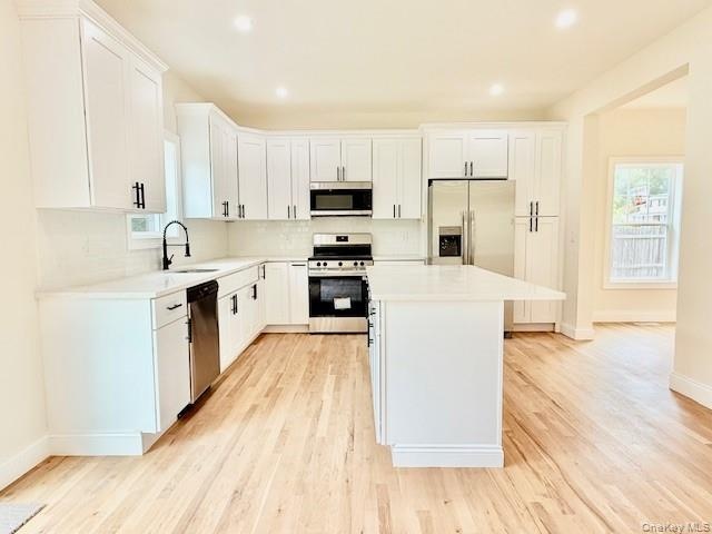 - Kitchen with appliances with stainless steel finishes, tasteful backsplash, white cabinets, recessed lighting, and light wood-type flooring