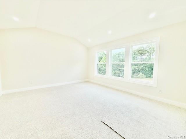 - Carpeted empty room featuring vaulted ceiling and recessed lighting