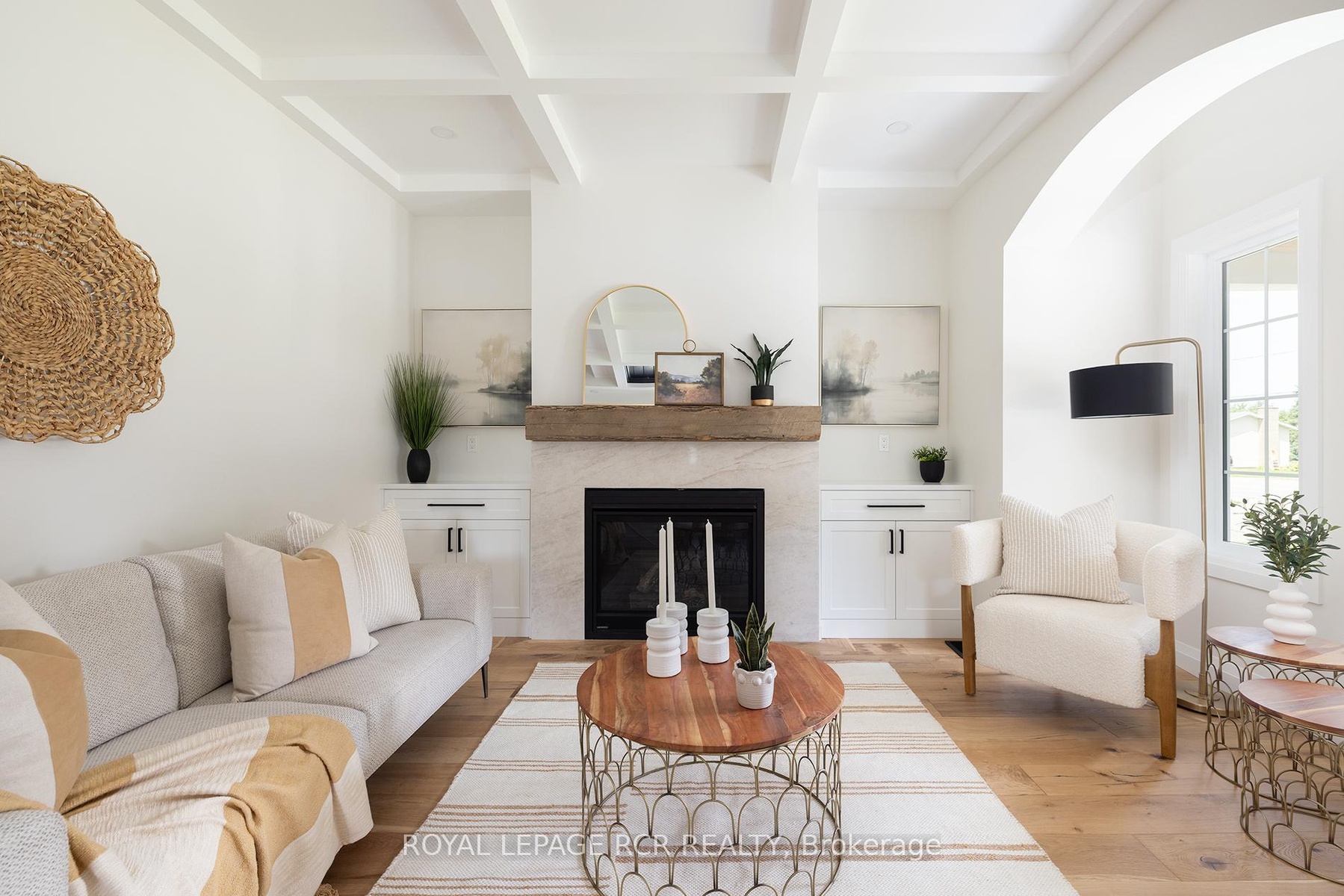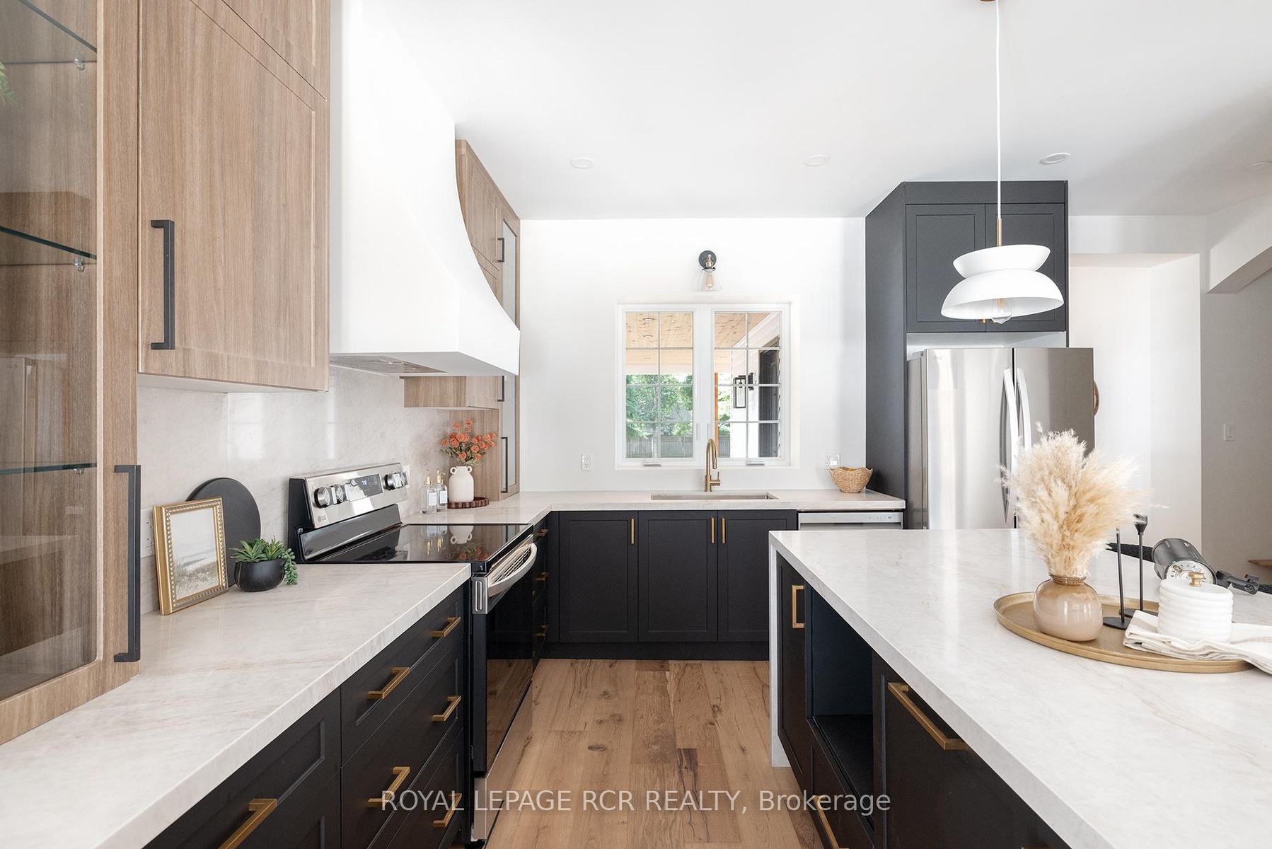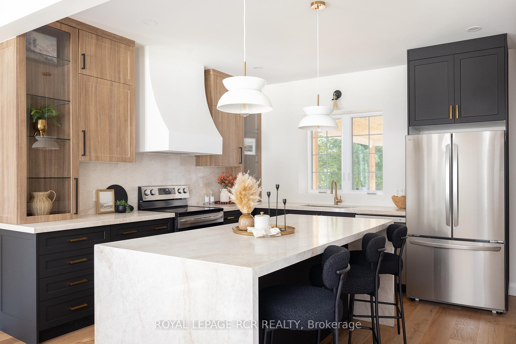 Nestled on an expansive lot in downtown Arthur, this exquisite 4 bedroom, 3 bathroom home has undergone a complete transformation, blending classic architecture with elevated modern finishes. The main level impresses with wide-plank hardwood flooring and a light-filled living room anchored by a gas fireplace clad in Taj Mahal quartz, framed by large windows and a coffered ceiling. The adjacent open concept kitchen and dining area is a showpiece of design, featuring an oversized centre island with a waterfall quartz countertop and breakfast bar, pendant lighting, a custom plaster range hood, pot lighting, and full-height Taj Mahal quartz backsplash and counters that carry the stones elegant detailing throughout. Arched windows throughout the principal rooms add a graceful architectural touch, while a beautifully appointed mudroom at the rear of the home offers built-in storage and striking herringbone brick tile underfoot. A versatile main floor room provides the option for a family room or fifth bedroom, complemented by a stylish 4 piece bathroom and convenient main floor laundry. The upper level is equally impressive. The primary suite offers a walk-through closet and an elegant 5 piece ensuite with a curbless walk-in tiled shower, stationary glass, soaker tub, and double vanity. Three additional bedrooms provide generous proportions and share a modern 4 piece main bath. Outdoors, a wraparound covered back deck extends your living space, ideal for entertaining or relaxing while overlooking the spacious, private yard. A brand new detached 1.5 car garage adds functionality to this truly turnkey property. From curated finishes to thoughtful functionality, every detail of this home has been carefully considered offering a rare opportunity to own a truly exceptional home in one of Arthur's most established neighbourhoods.