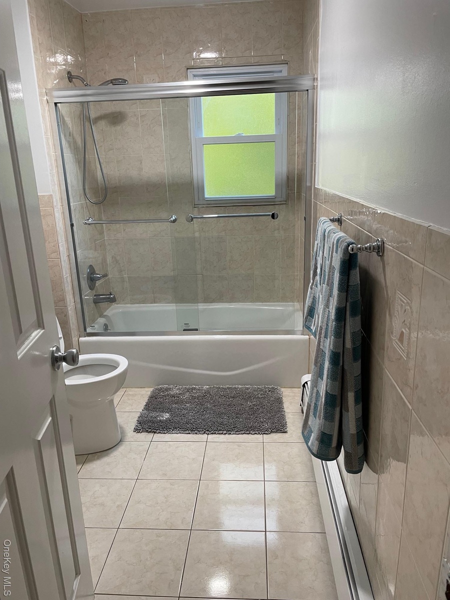 - Full bath with enclosed tub / shower combo, tile patterned flooring, and tile walls