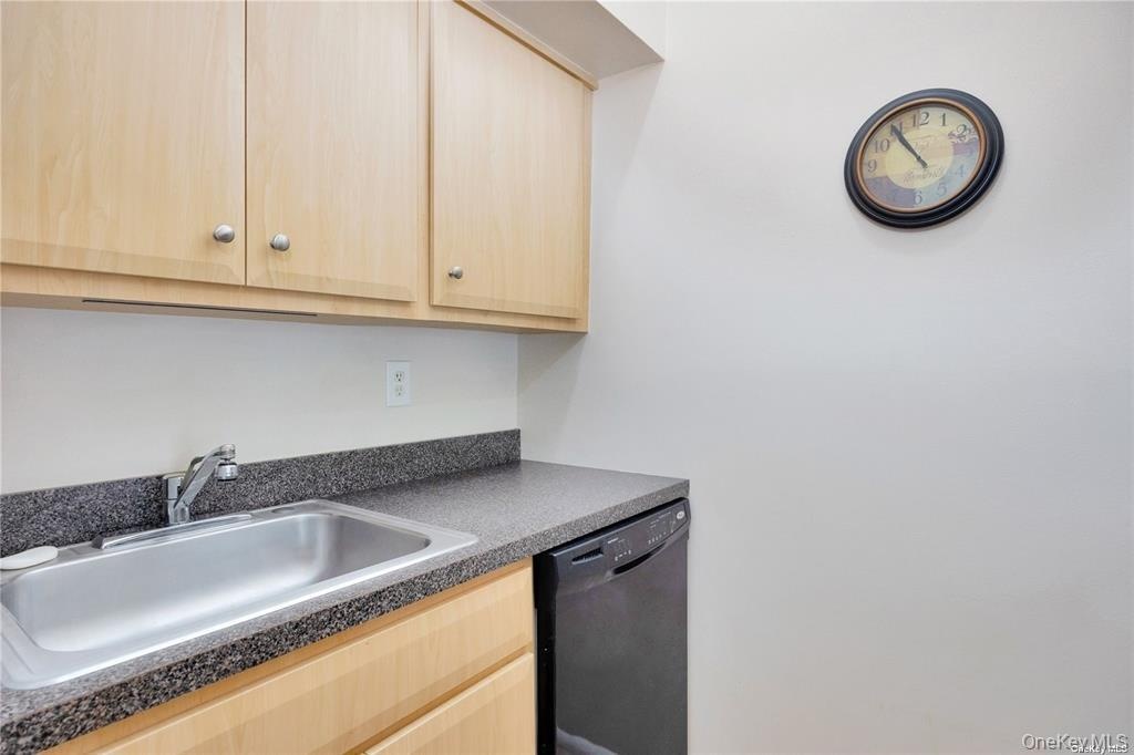 - Kitchen with light brown cabinets, dark countertops, and dishwasher