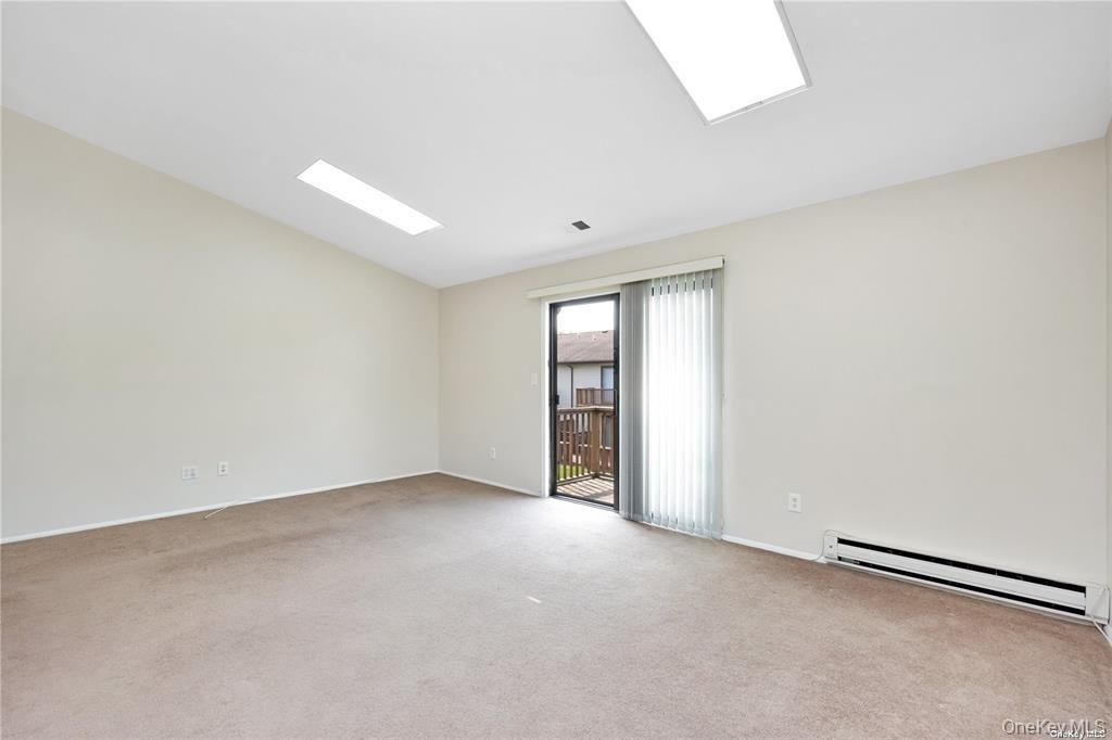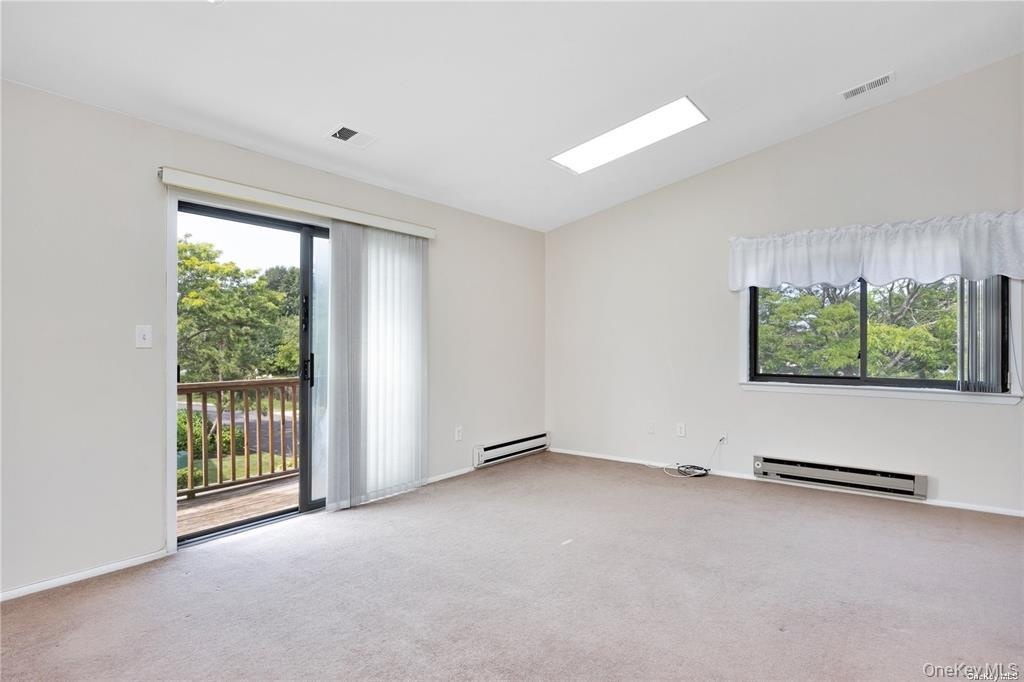 - Empty room with a baseboard radiator, a skylight, light carpet, and vaulted ceiling