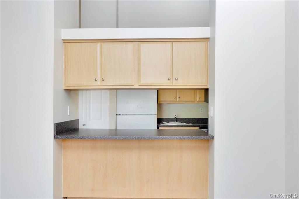- Kitchen with light brown cabinets, freestanding refrigerator, and dark countertops