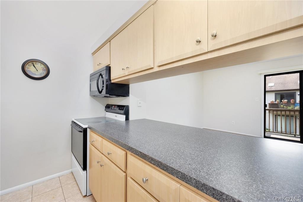 - Kitchen with light brown cabinets, electric range, black microwave, light tile patterned floors, and dark countertops