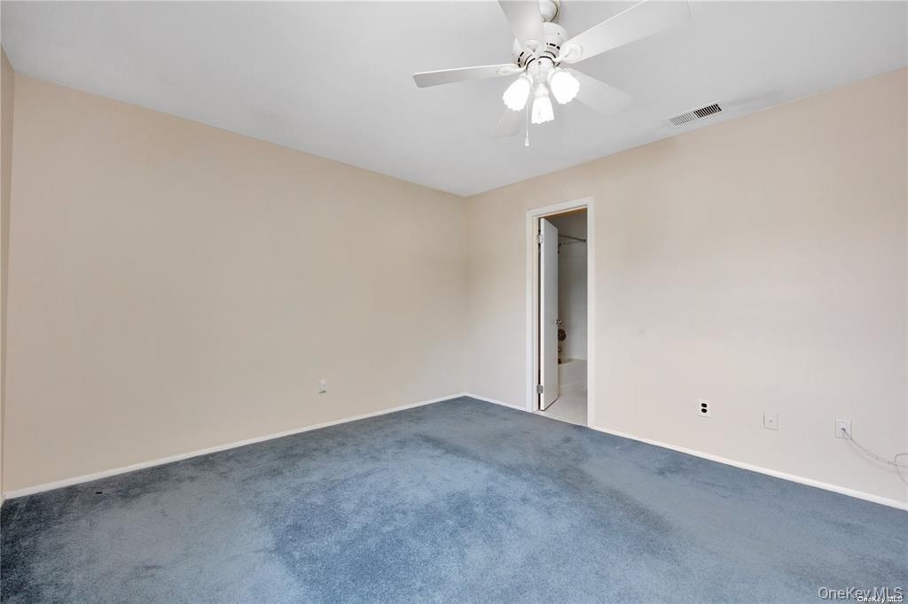 - Carpeted empty room with baseboard heating and a ceiling fan