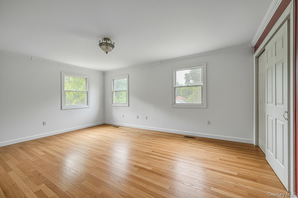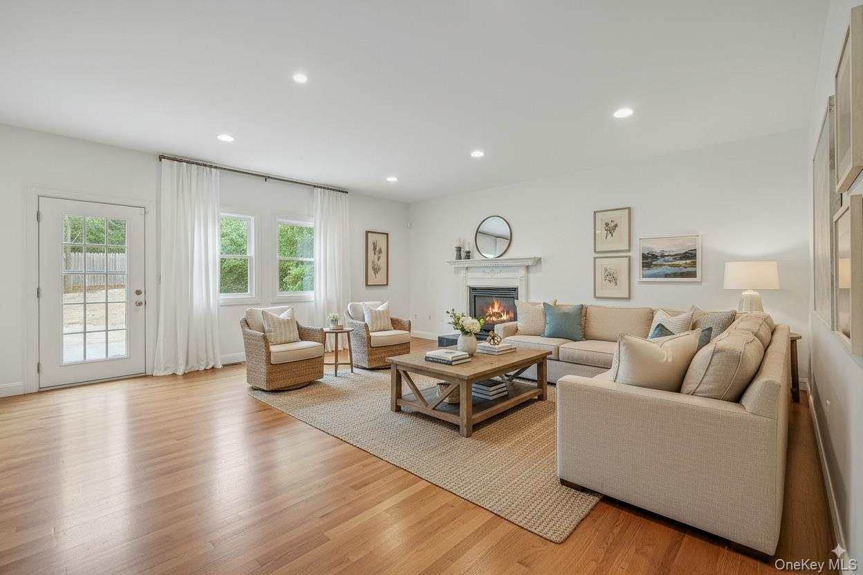 - Primary sitting area with walls painted off white, wood floors, and furniture virtually staged