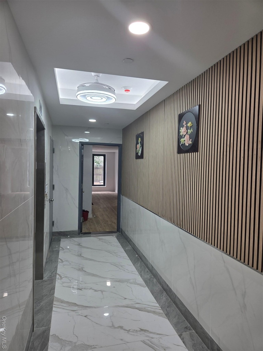 - Hallway featuring marble tiled floors, a raised ceiling, and recessed lighting