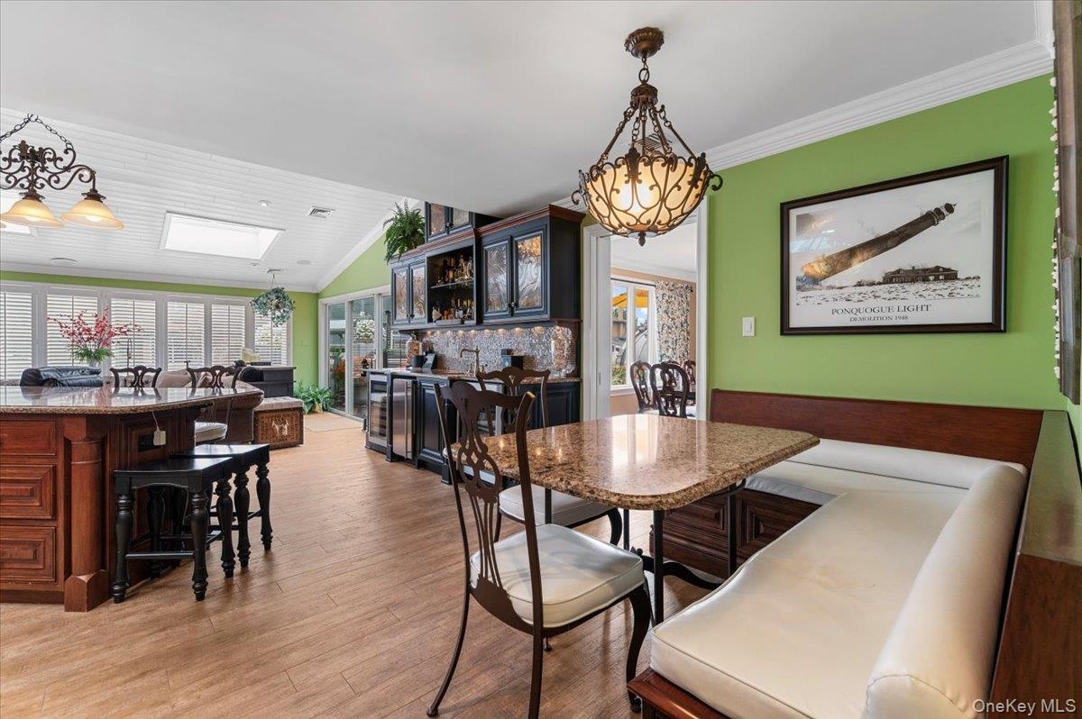 - Dining room with beverage cooler, a chandelier, ornamental molding, and light wood-style flooring