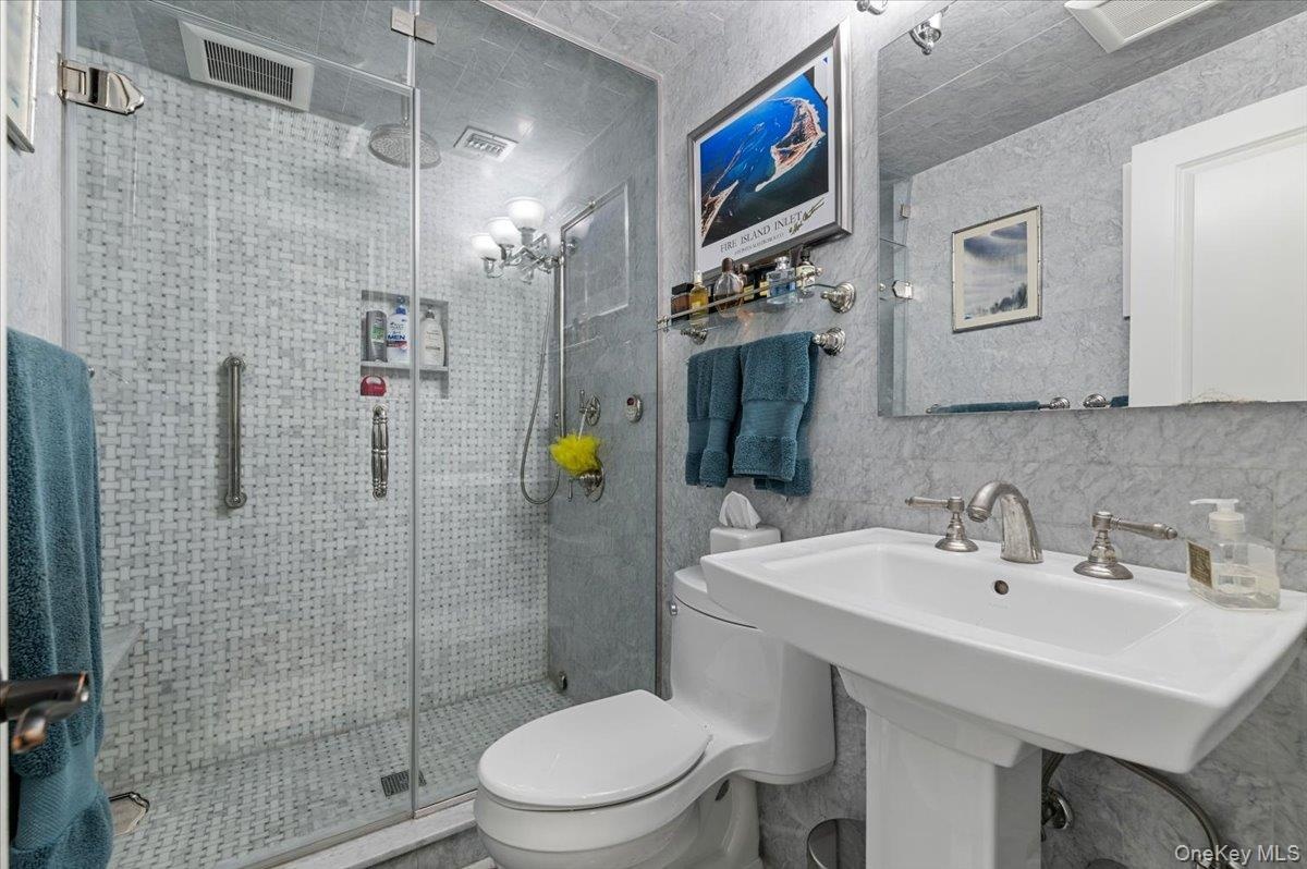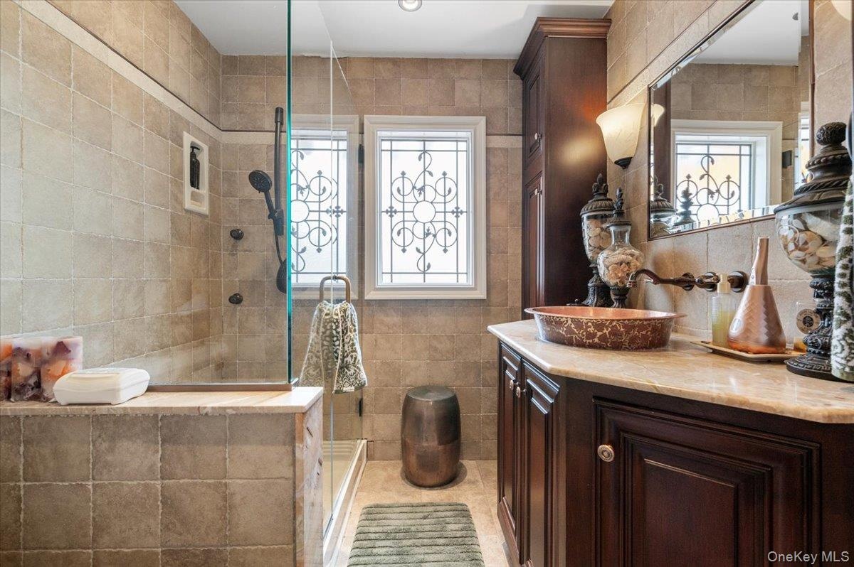 - Bathroom with a stall shower, decorative backsplash, and tile walls