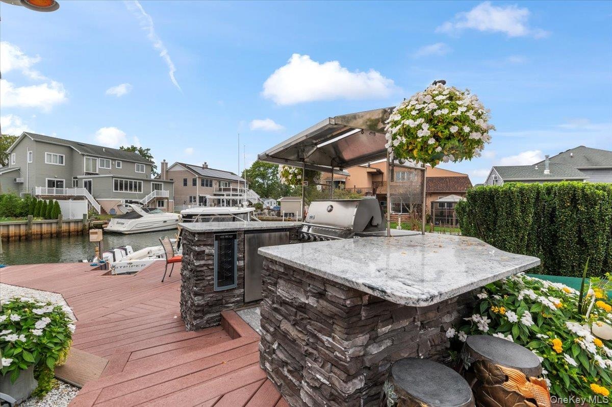 - Wooden deck with a residential view, an outdoor kitchen, a water view, and wine cooler