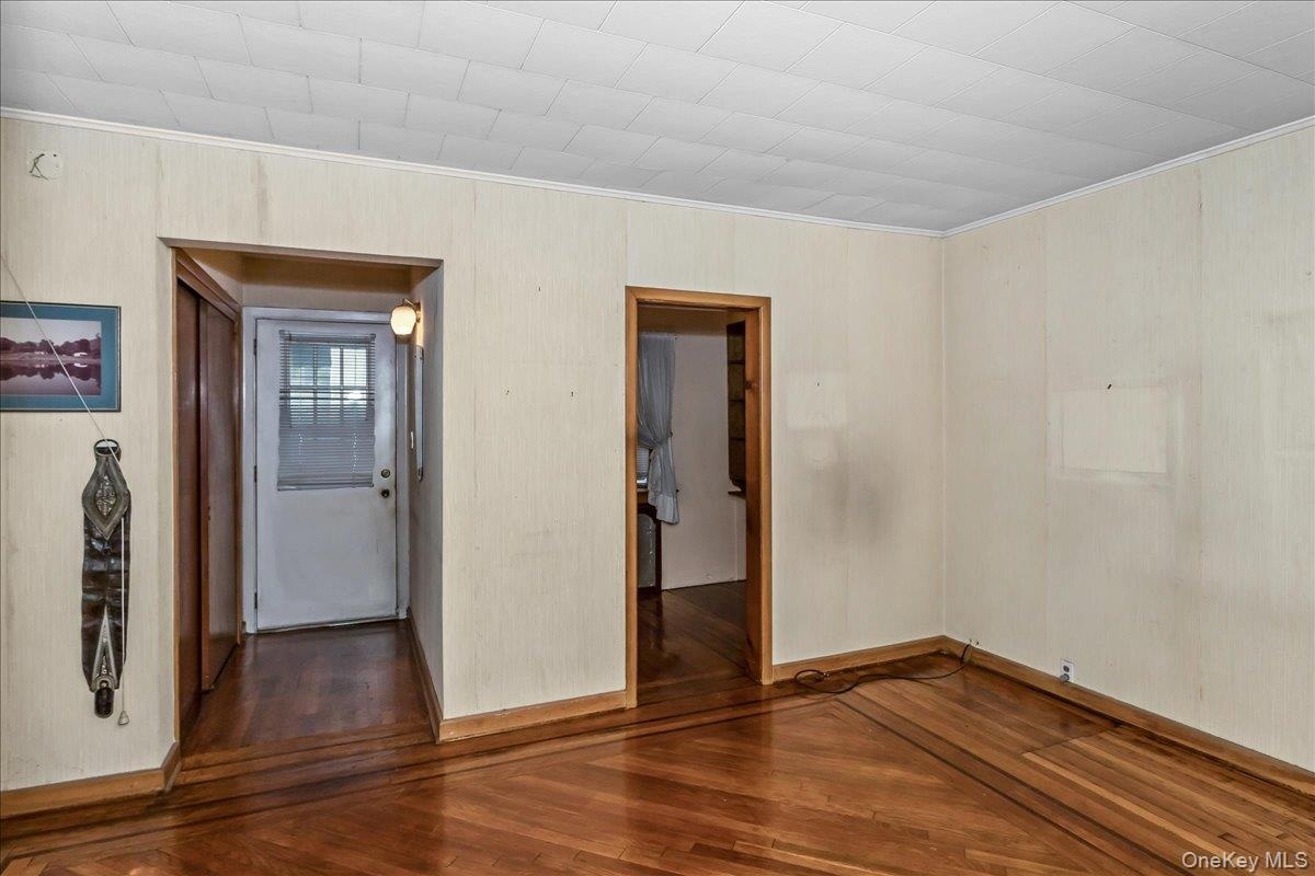 - Unfurnished room with ornamental molding, wood finished floors, and radiator heating unit