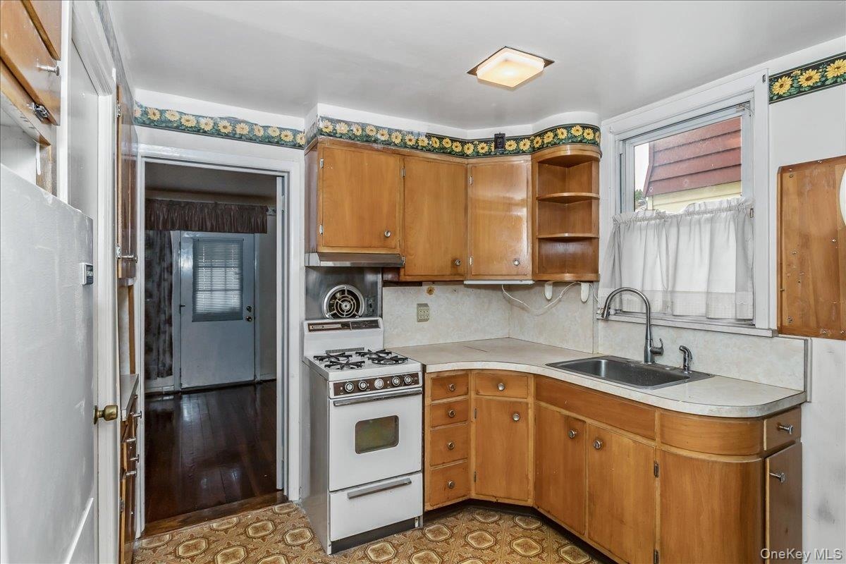 - Kitchen with brown cabinets, open shelves, white range with gas cooktop, light countertops, and freestanding refrigerator