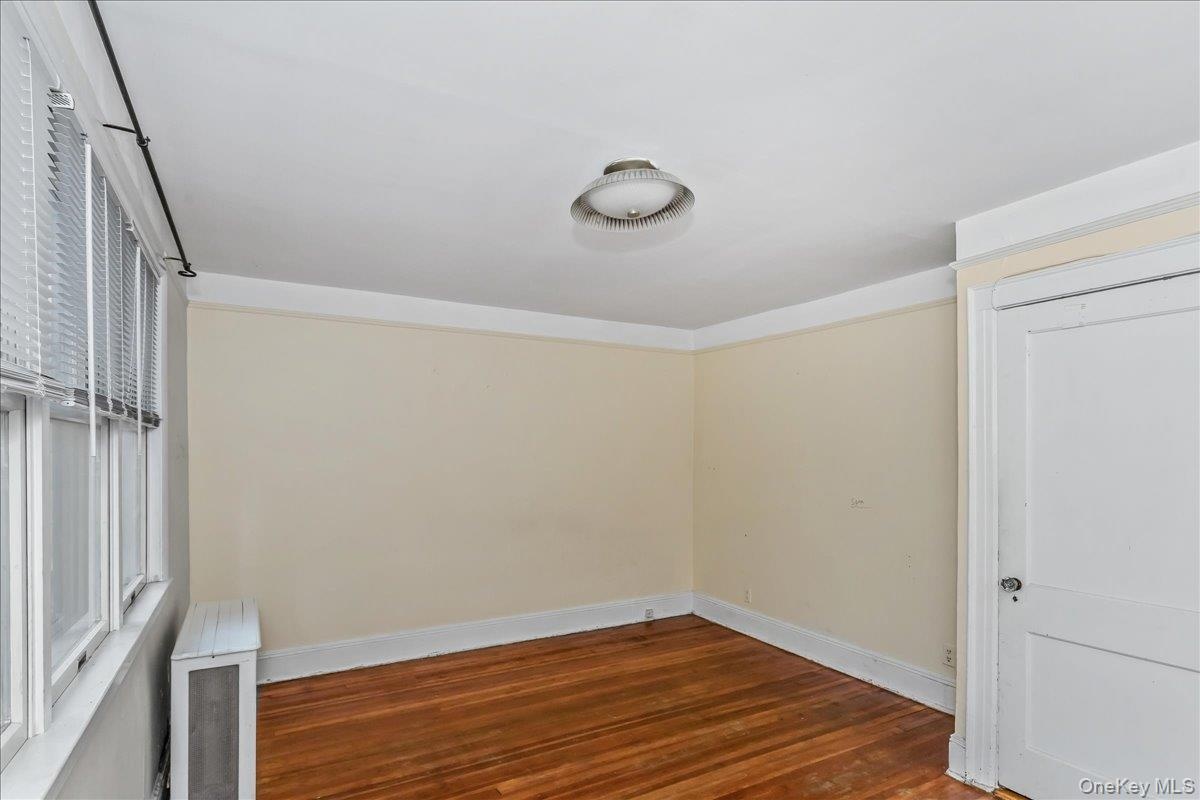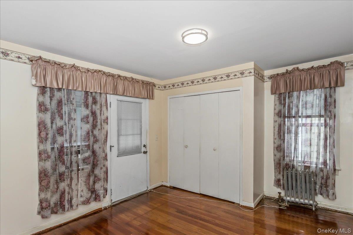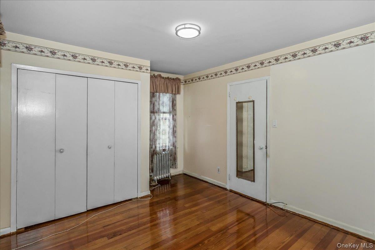 - Unfurnished bedroom with wood finished floors and radiator heating unit