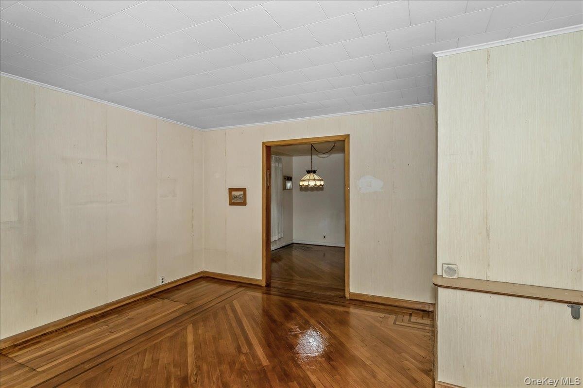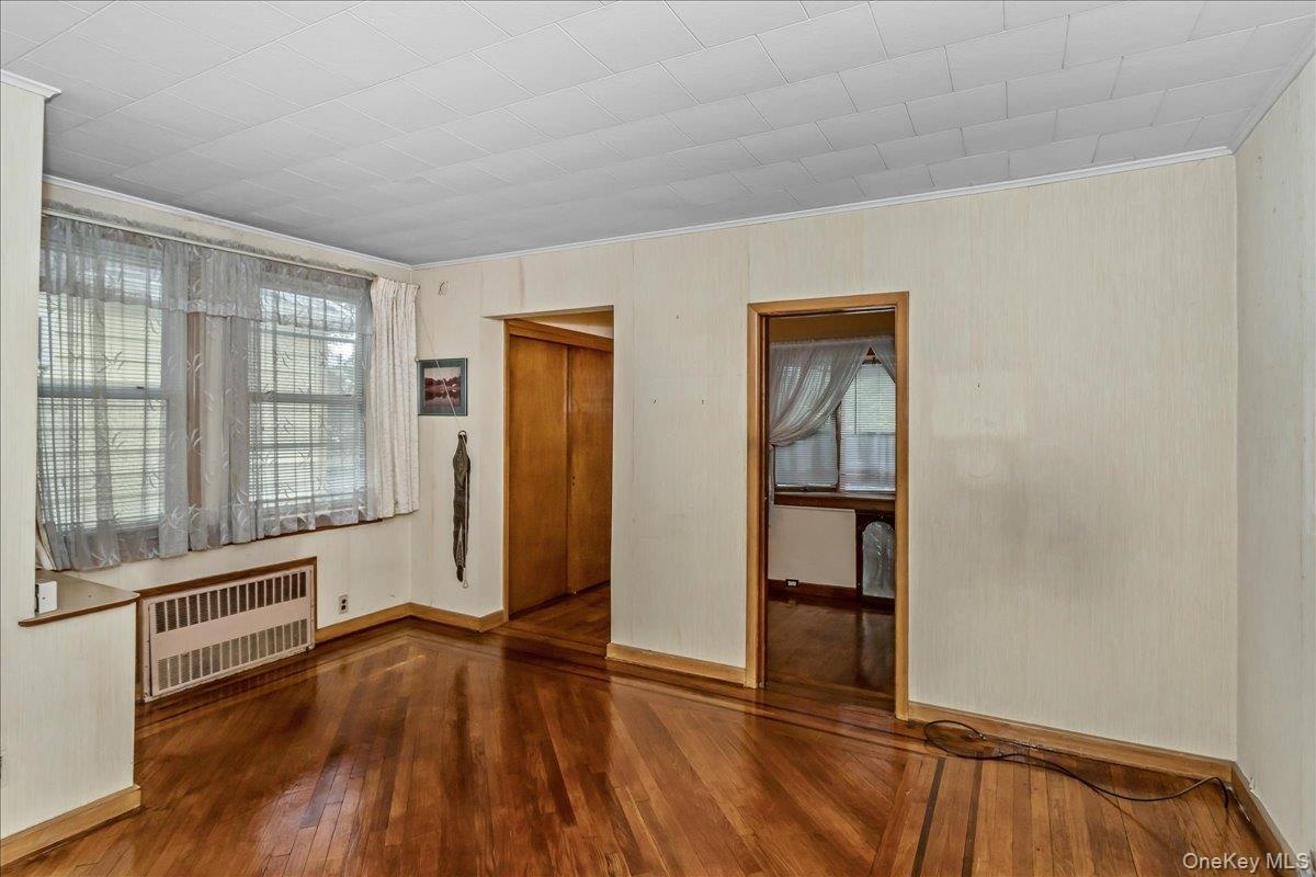 - Empty room featuring hardwood / wood-style floors, radiator heating unit, and ornamental molding
